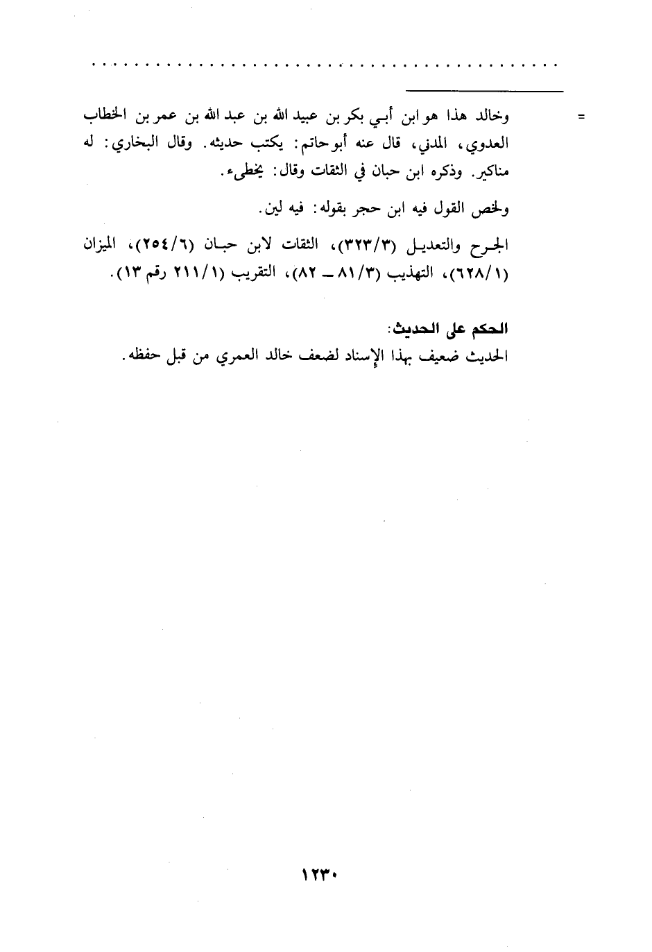= وخالد هذا هو ابن أبي بكر بن عبيد الله بن عبد الله بن عمر بن الخطاب العدوي، المدني، قال عنه أبو حاتم: يكتب حديثه. وقال البخاري: له مناكير. وذكره ابن حبان في الثقات وقال: يخطيء.