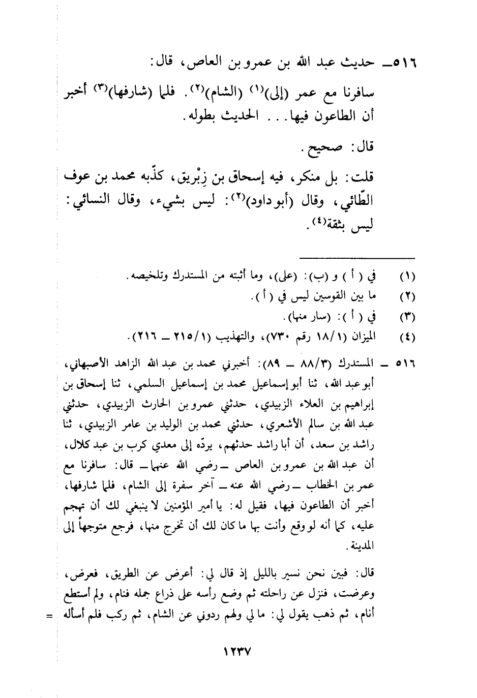 516 - المستدرك (3/ 88 - 89): أخبرني محمد بن عبد الله الزاهد الأصبهاني، أبو عبد الله، ثنا أبو إسماعيل محمد بن إسماعيل السلمي، ثنا إسحاق بن إبراهيم بن العلاء الزبيدي، حدثني عمرو بن الحارث الزبيدي، حدثني عبد الله بن سالم الأشعري، حدثني محمد بن الوليد بن عامر الزبيدي، ثنا راشد بن سعد، أن أبا راشد حدثهم، يردّه إلى معدي كرب بن عبد كلال، أن عبد الله بن عمرو بن العاص -رضي الله عنهما- قال: سافرنا مع عمر بن الخطاب -رضي الله عنه- آخر سفرة إلى الشام، فلما شارفها، أخبر أن الطاعون فيها، فقيل له: يا أمير المؤمنين لا ينبغي لك أن تهجم عليه، كما أنه لو وقع وأنت بها ما كان لك أن تخرج منها، فرجع متوجهاً إلى المدينة.