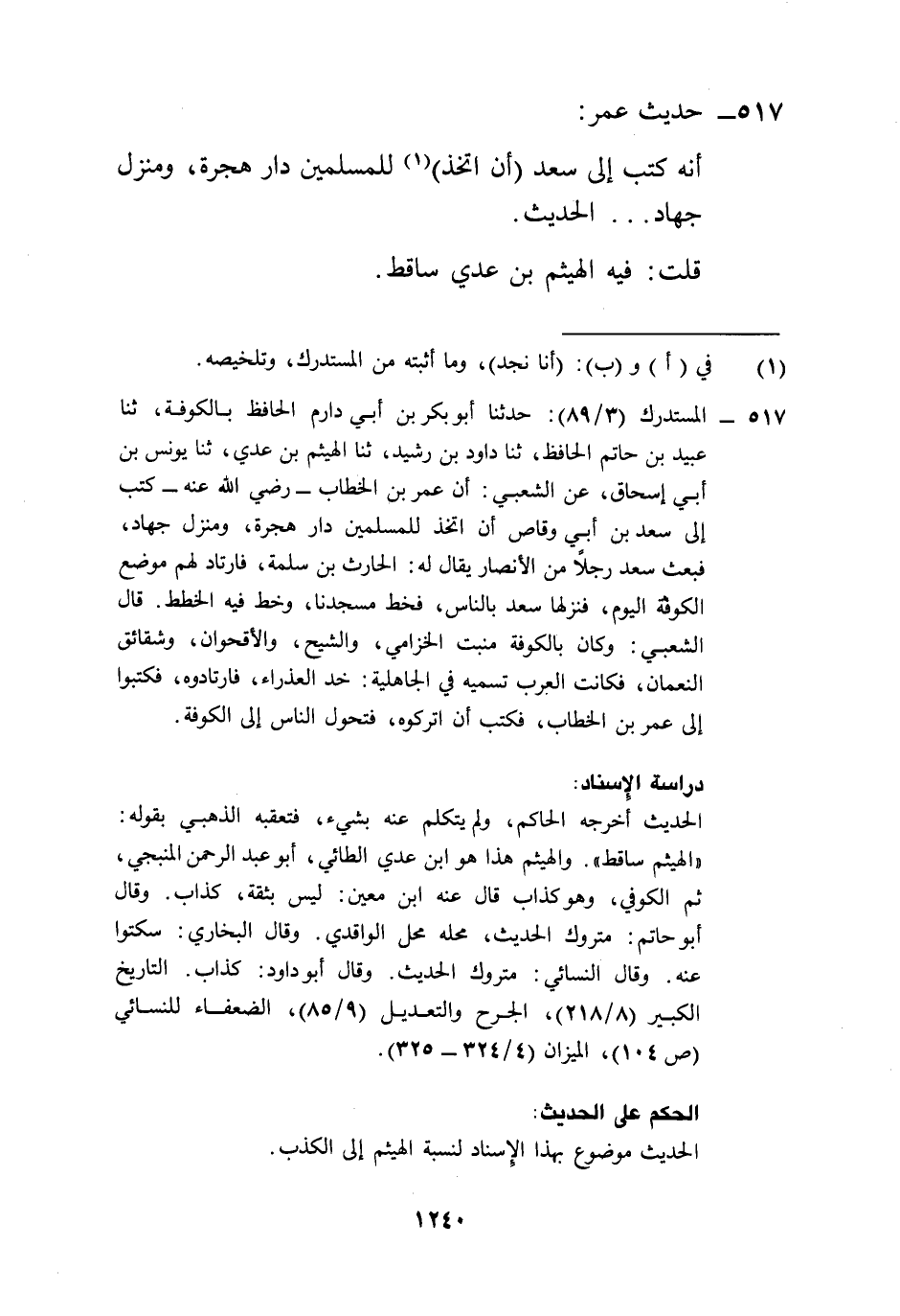 517 - المستدرك (3/ 89): حدثنا أبو بكر بن أبي دارم الحافظ بالكوفة، ثنا عبيد بن حاتم الحافظ، ثنا داود بن رشيد، ثنا الهيثم بن عدي، ثنا يونس بن أبي إسحاق، عن الشعبي: أن عمر بن الخطاب -رضي الله عنه- كتب إلى سعد بن أبي وقاص أن اتخذ للمسلمين دار هجرة، ومنزل جهاد، فبعث سعد رجلًا من الأنصار يقال له: الحارث بن سلمة، فارتاد لهم موضع الكوفة اليوم، فنزلها سعد بالناس، فخط مسجدنا، وخط فيه الخطط. قال الشعبي: وكان بالكوفة منبت الخزامي، والشيح، والأقحوان، وشقائق النعمان، فكانت العرب تسميه في الجاهلية: خد العذراء، فارتادوه، فكتبوا إلى عمر بن الخطاب، فكتب أن اتركوه، فتحول الناس إلى الكوفة.
