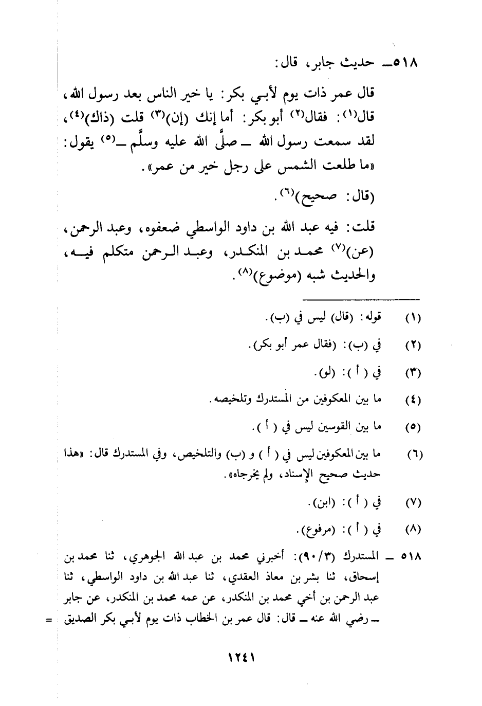 518 - المستدرك (3/ 90): أخبرني محمد بن عبد الله الجوهري، ثنا محمد بن إسحاق، ثنا بشر بن معاذ العقدي، ثنا عبد الله بن داود الواسطي، ثنا عبد الرحمن بن أخي محمد بن المنكدر، عن عمه محمد بن المنكدر، عن جابر -رضي الله عنه- قال: قال عمر بن الخطاب ذات يوم لأبي بكر الصديق =