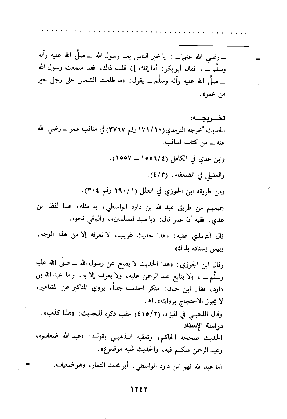 جميعهم من طريق عبد الله بن داود الواسطي، به مثله، عدا لفظ ابن عدي، ففيه أن عمر قال: "يا سيد المسلمين"، والباقي نحوه.