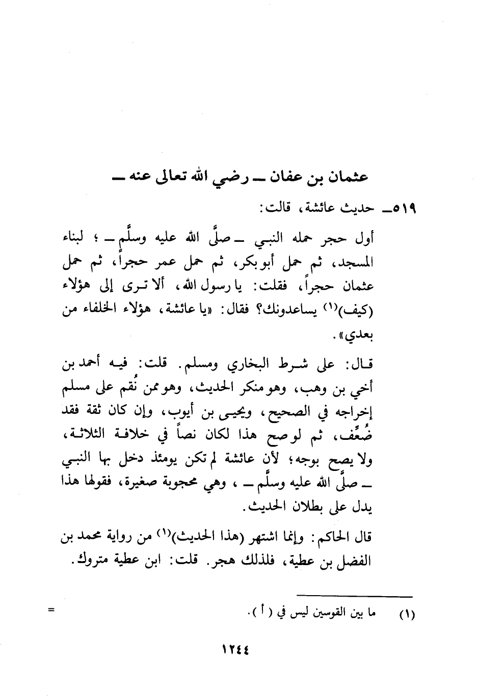 قال: على شرط البخاري ومسلم. قلت: فيه أحمد بن أخي بن وهب، وهو منكر الحديث، وهو ممن نُقم على مسلم إخراجه في الصحيح، ويحيى بن أيوب، وإن كان ثقة فقد ضُعِّف، ثم لو صح هذا لكان نصاً في خلافة الثلاثة، ولا يصح بوجه؛ لأن عائشة لم تكن يومئذ دخل بها النبي -صلَّى الله عليه وسلَّم-، وهي محجوبة صغيرة، فقولها هذا يدل على بطلان الحديث.