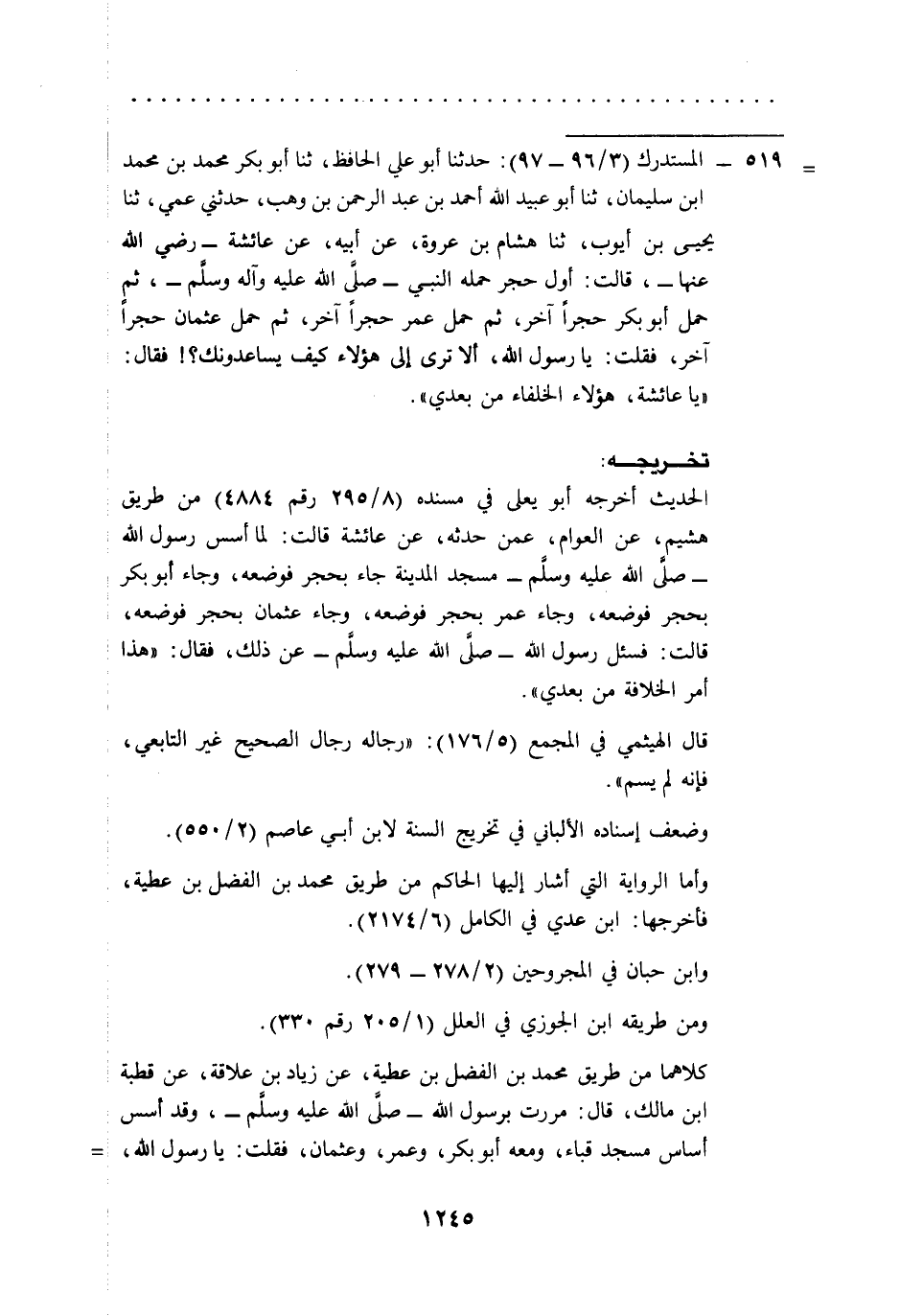 = 519 - المستدرك (3/ 96 - 97): حدثنا أبو علي الحافظ، ثنا أبو بكر محمد بن محمد ابن سليمان، ثنا أبو عبيد الله أحمد بن عبد الرحمن بن وهب، حدثني عمي، ثنا يحيى بن أيوب، ثنا هشام بن عروة، عن أبيه، عن عائشة -رضي الله عنها-، قالت: أول حجر حمله النبي -صلى الله عليه وآله وسلم-، ثم حمل أبو بكر حجراً آخر، ثم حمل عمر حجراً آخر، ثم حمل عثمان حجراً آخر، فقلت: يا رسول الله، ألا ترى إلى هؤلاء كيف يساعدونك؟! فقال: "يا عائشة، هؤلاء الخلفاء من بعدي".