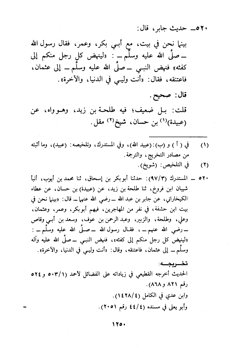 520 - المستدرك (3/ 97): حدثنا أبو بكر بن إسحاق، ثنا محمد بن أيوب، أنبأ شيبان ابن فروخ، ثنا طلحة بن زيد، عن (عبيدة) بن حسان، عن عطاء الكيخاراني، عن جابر بن عبد الله -رضي الله عنهما- قال: "بينما نحن في بيت ابن حشفة، في نفر من المهاجرين، فيهم أبو بكر، وعمر، وعثمان، وعلي، وطلحة، والزبير، وعبد الرحمن بن عوف، وسعد بن أبي وقاص -رضي الله عنهم-، فقال رسول الله -صلى الله عليه وسلم-: "لينهض على رجل منكم إلى كفئه"، فنهض النبي -صلى الله عليه وآله وسلم- إلى عثمان، فاعتنقه، وقال: "أنت وليي في الدنيا، والآخرة".