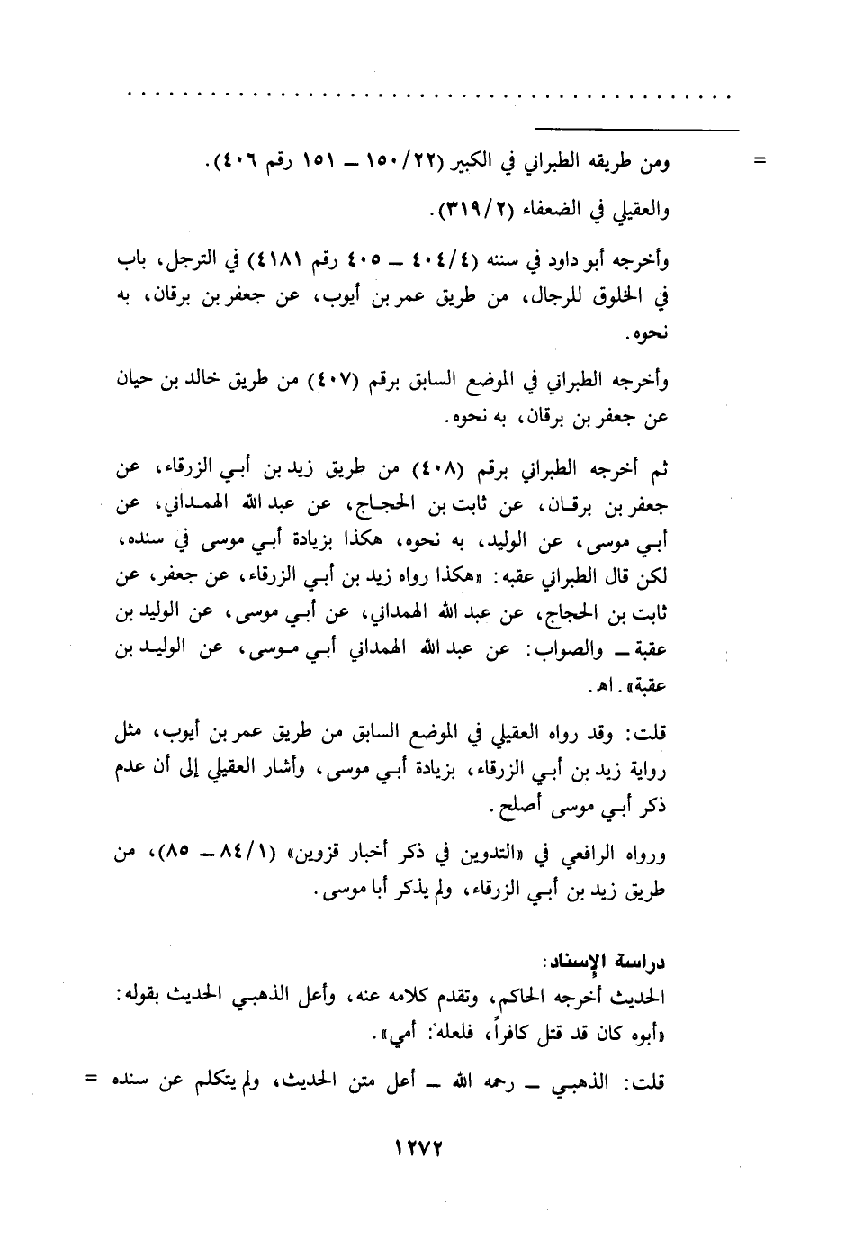 قلت: وقد رواه العقيلي في الموضع السابق من طريق عمر بن أيوب، مثل رواية زيد بن أبي الزرقاء، بزيادة أبي موسى، وأشار العقيلي إلى أن عدم ذكر أبي موسى أصلح.