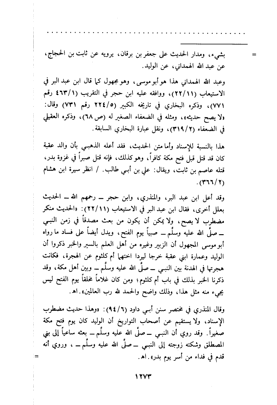 وقال المنذري في مختصر سنن أبى داود (6/ 94): "وهذا حديث مضطرب الإسناد، ولا يستقيم عن أصحاب التواريخ أن الوليد كان يوم فتح مكة صغيراً. وقد روي أن النبي -صلى الله عليه وسلم- بعثه ساعياً إلى بني المصطلق وشكته زوجته إلى النبي -صلى الله عليه وسلم-، وروي أنه قدم في فداء من أسر يوم بدر". اهـ. =