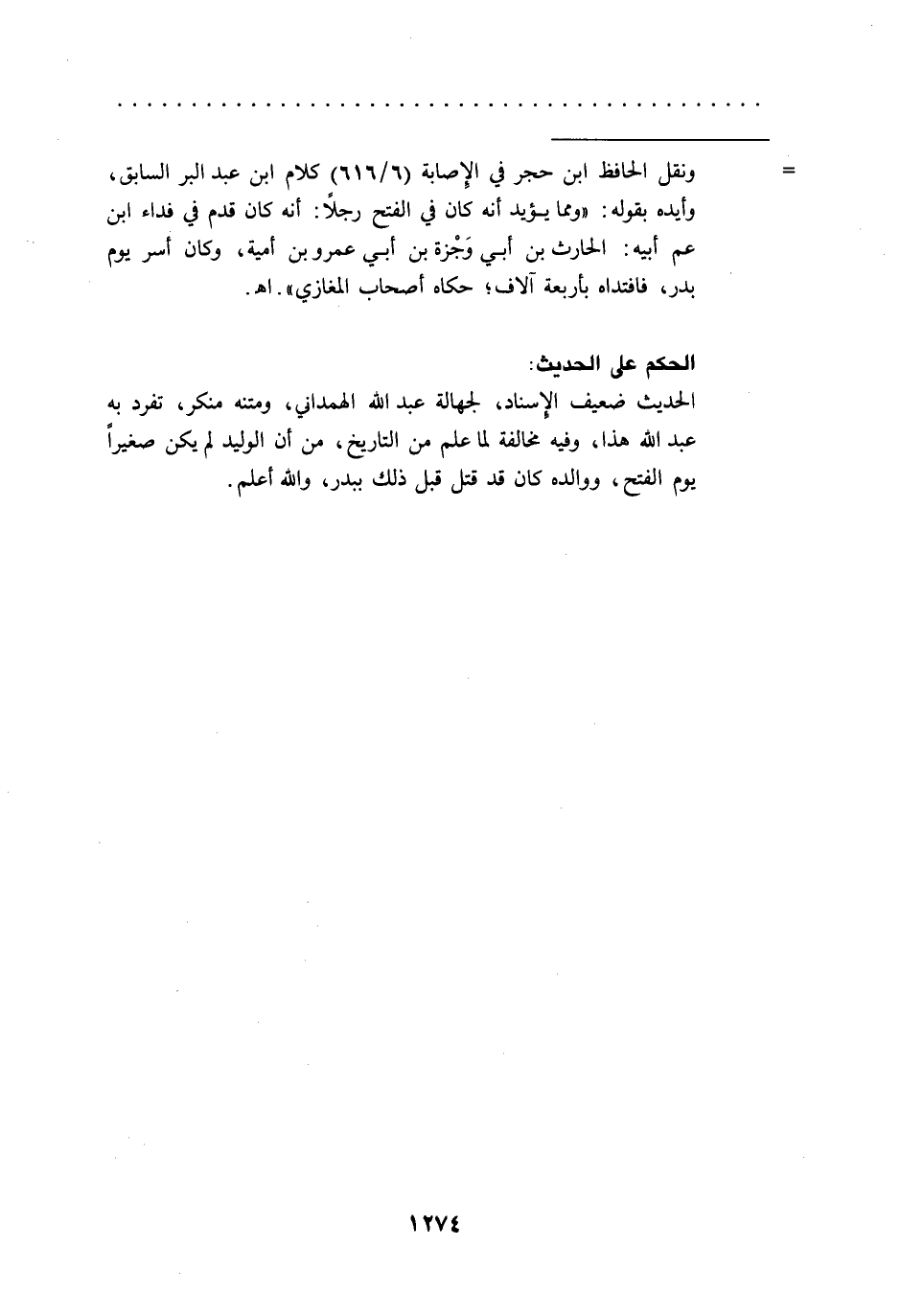 = ونقل الحافظ ابن حجر في الِإصابة (6/ 616) كلام ابن عبد البر السابق، وأيده بقوله: "ومما يؤيد أنه كان في الفتح رجلاً: أنه كان قدم في فداء ابن عم أبيه: الحارث بن أبي وَجْزة بن أبي عمرو بن أمية، وكان أسر يوم بدر، فافتداه بأربعة آلاف. حكاه أصحاب المغازي". اهـ.