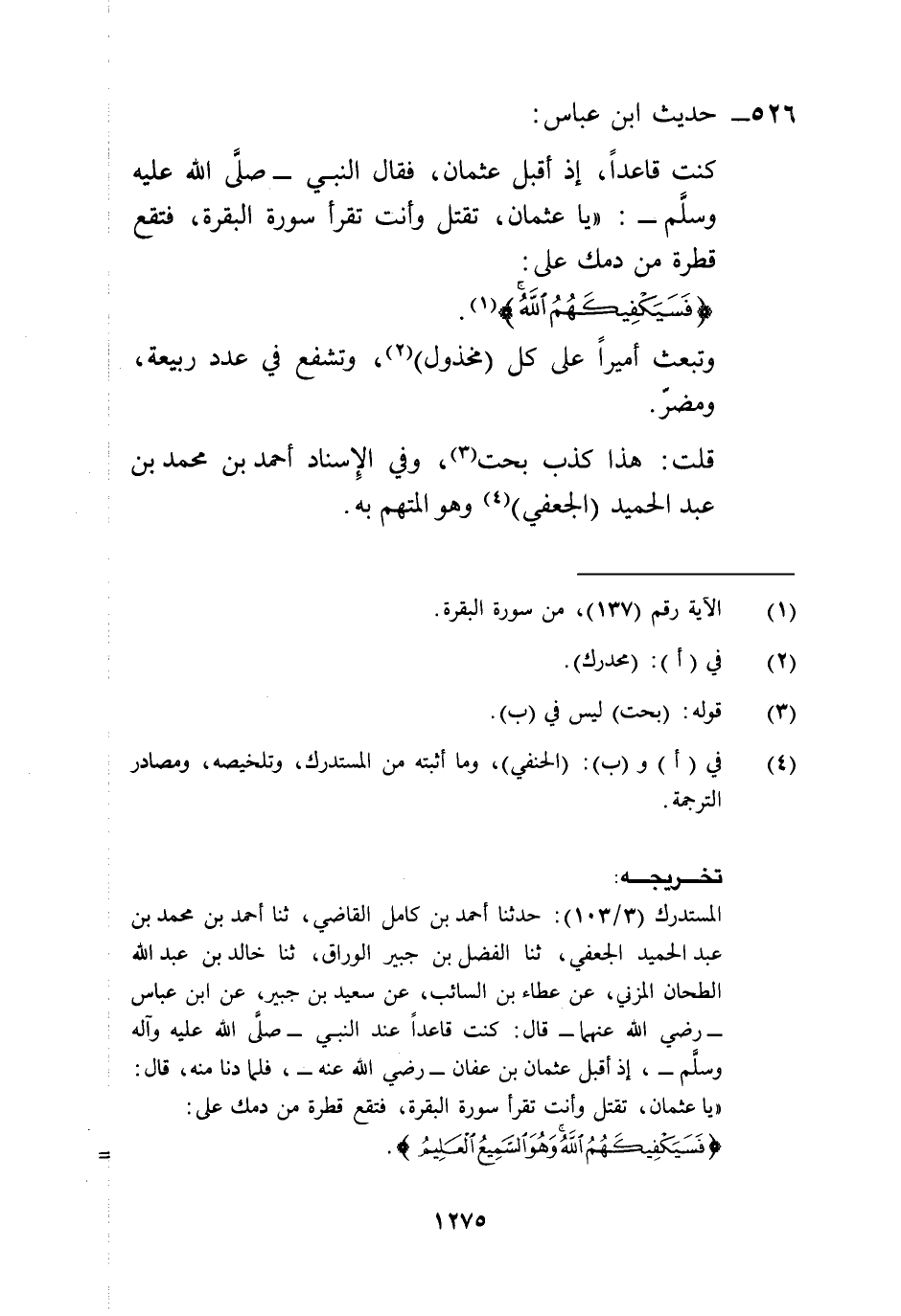 المستدرك (3/ 103): حدثنا أحمد بن كامل القاضي، ثنا أحمد بن محمد بن عبد الحميد الجعفي، ثنا الفضل بن جبير الوراق، ثنا خالد بن عبد الله الطحان المزني، عن عطاء بن السائب، عن سعيد بن جبير، عن ابن عباس -رضي الله عنهما- قال: كنت قاعداً عند النبي -صلى الله عليه وآله وسلم-، إذ أقبل عثمان بن عفان -رضي الله عنه-، فلما دنا منه، قال: "يا عثمان، تقتل وأنت تقرأ سورة البقرة، فتقع قطرة من دمك على:
