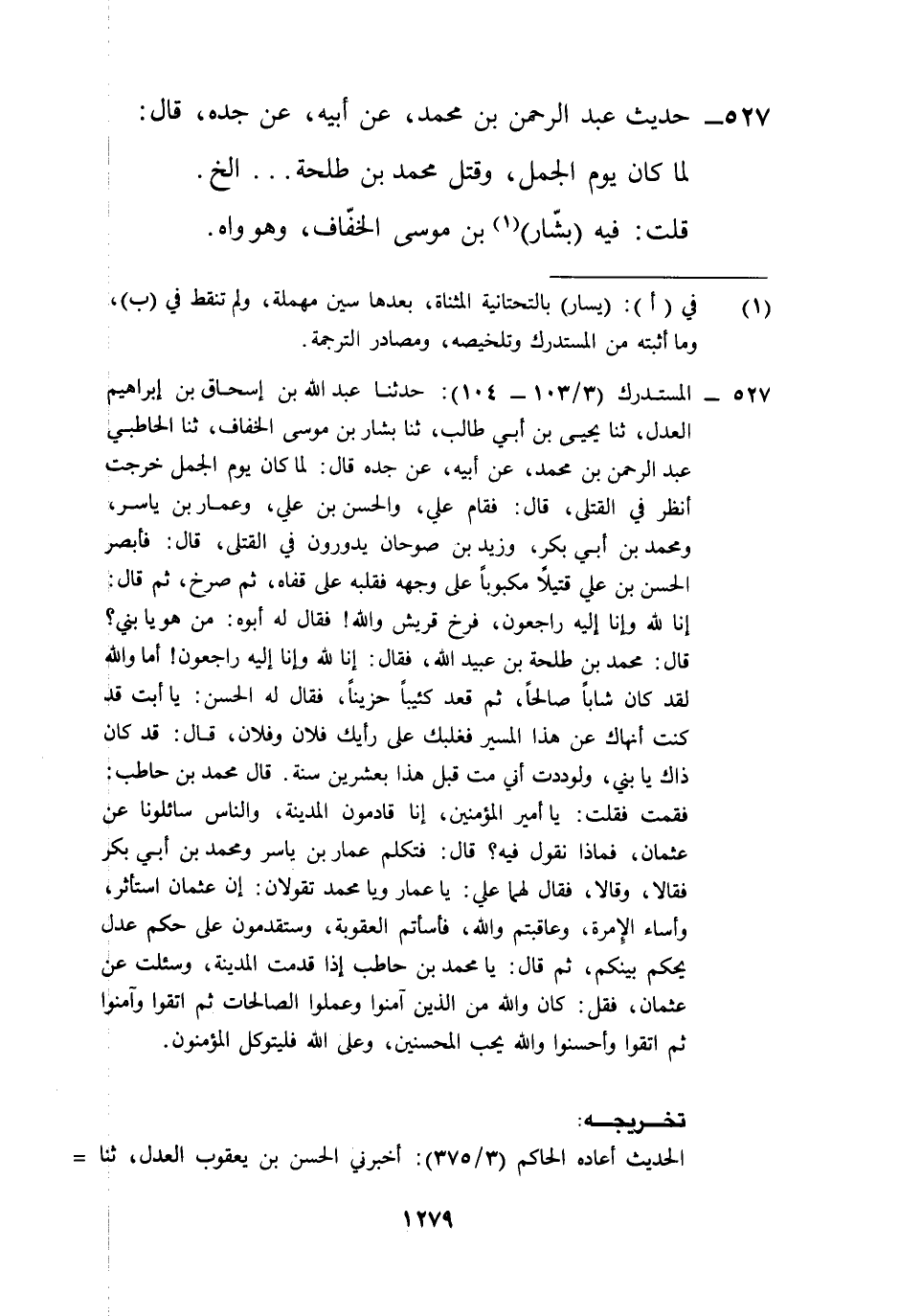 527 - المستدرك (3/ 103 - 104): حدثنا عبد الله بن إسحاق بن إبراهيم العدل، ثنا يحيى بن أبي طالب، ثنا بشار بن موسى الخفاف، ثنا الحاطبي عبد الرحمن بن محمد، عن أبيه، عن جده قال: لما كان يوم الجمل خرجت أنظر في القتلى، قال: فقام علي، والحسن بن علي، وعمار بن ياسر، ومحمد بن أبي بكر، وزيد بن صوحان يدورون في القتلى، قال: فأبصر الحسن بن علي قتيلاً مكبوباً على وجهه فقلبه على قفاه، ثم صرخ، ثم قال: إنا لله وإنا إليه راجعون، فرخ قريش والله! فقال له أبوه: من هو يا بني؟ قال: محمد بن طلحة بن عبيد الله، فقال: إنا لله وإنا إليه راجعون! أما والله لقد كان شاباً صالحاً، ثم قعد كئيباً حزيناً، فقال له الحسن: يا أبت قد كنت أنهاك عن هذا المسير فغلبك على رأيك فلان وفلان، قال: قد كان ذاك يا بني، ولوددت أني مت قبل هذا بعشرين سنة. قال محمد بن حاطب: فقمت فقلت: يا أمير المؤمنين، إنا قادمون المدينة، والناس سائلونا عن عثمان، فماذا نقول فيه؟ قال: فتكلم عمار بن ياسر ومحمد بن أبي بكر فقالا، وقالا، فقال لهما علي: يا عمار ويا محمد تقولان: إن عثمان استأثر، وأساء الِإمرة، وعاقبتم والله، فأسأتم العقوبة، وستقدمون على حكم عدل يحكم بينكم، ثم قال: يا محمد بن حاطب إذا قدمت المدينة، وسئلت عن عثمان، فقل: كان والله من الذين آمنوا وعملوا الصالحات ثم اتقوا وآمنوا ثم اتقوا وأحسنوا والله يحب الحسنين، وعلى الله فليتوكل المؤمنون.