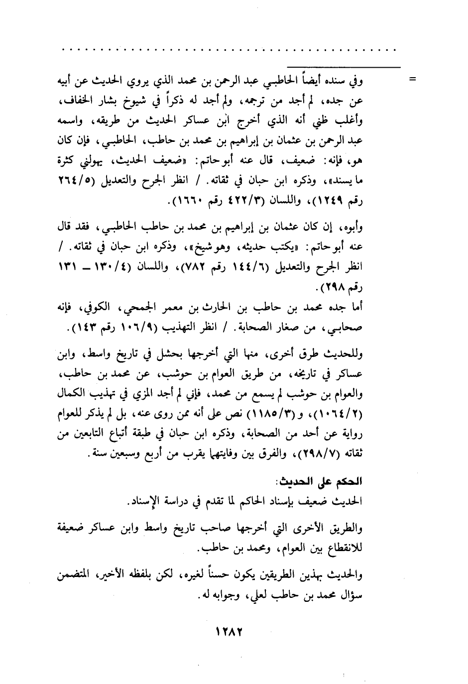 = وفي سنده أيضاً الحاطبي عبد الرحمن بن محمد الذي يروي الحديث عن أبيه عن جده، لم أجد من ترجمه، ولم أجد له ذكراً في شيوخ بشار الخفاف، وأغلب ظني أنه الذي أخرج ابن عساكر الحديث من طريقه، واسمه عبد الرحمن بن عثمان بن إبراهيم بن محمد بن حاطب، الحاطبي، فإن كان هو، فإنه: ضعيف، قال عنه أبو حاتم: "ضعيف الحديث، يهولني كثرة ما يسند"، وذكره ابن حبان في ثقاته./ انظر الجرح والتعديل (5/ 264 رقم 1249)، واللسان (3/ 422رقم 1660).