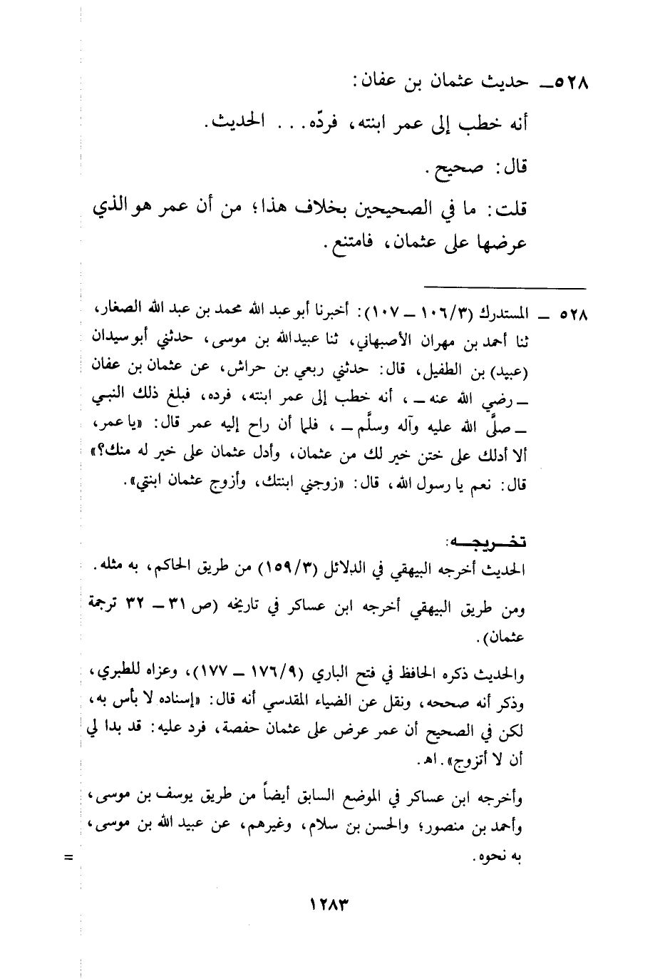 528 - المستدرك (3/ 106 - 107): أخبرنا أبو عبد الله محمد بن عبد الله الصفار، ثنا أحمد بن مهران الأصبهاني، ثنا عبيد الله بن موسى، حدثني أبو سيدان (عبيد) بن الطفيل، قال: حدثني ربعي بن حراش، عن عثمان بن عفان -رضي الله عنه-، أنه خطب إلى عمر ابنته، فرده، فبلغ ذلك النبي -صلى الله عليه وآله وسلم-، فلما أن راح إليه عمر قال: "يا عمر، ألا أدلك على ختن خير لك من عثمان، وأدل عثمان على خير له منك؟ " قال: نعم يا رسول الله، قال: "زوجني ابنتك، وأزوج عثمان ابنتي".
