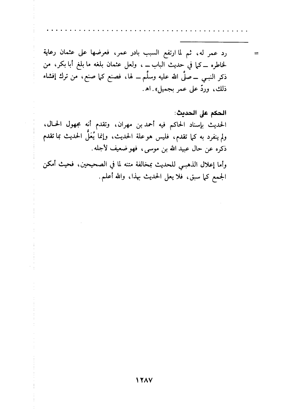 = رد عمر له، ثم لما ارتفع السبب بادر عمر، فعرضها على عثمان رعاية لخاطره -كما في حديث الباب-، ولعل عثمان بلغه ما بلغ أبا بكر، من ذكر النبي -صلى الله عليه وسلم- لها، فصنع كما صنع، من ترك إفشاء ذلك، وردّ على عمر بجميل". اهـ.
