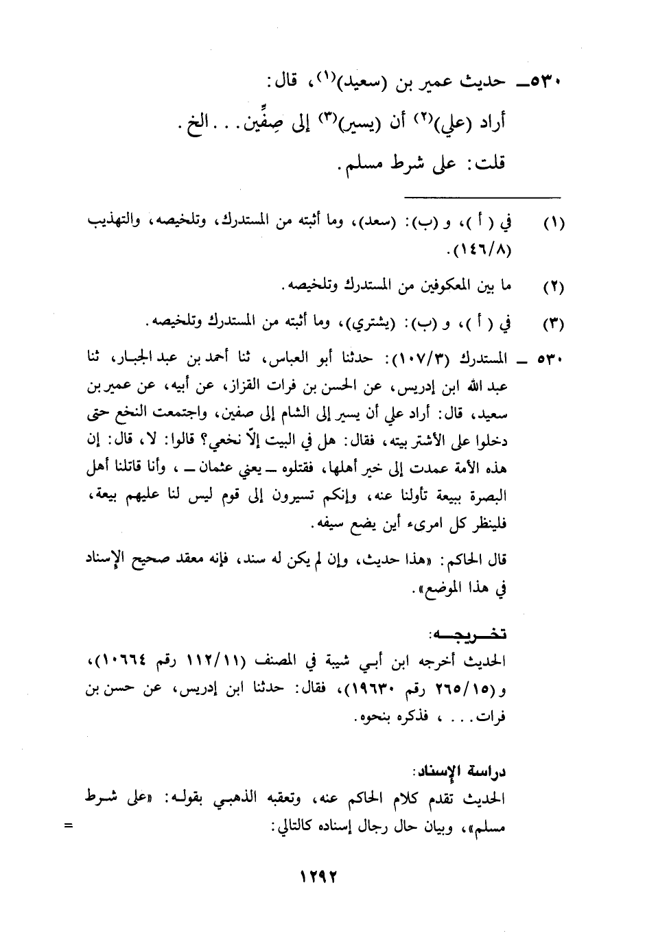 530 - المستدرك (3/ 107): حدثنا أبو العباس، ثنا أحمد بن عبد الجبار، ثنا عبد الله ابن إدريس، عن الحسن بن فرات القزاز، عن أبيه، عن عمير بن سعيد، قال: أراد علي أن يسير إلى الشام إلى صفين، واجتمعت النخع حتى دخلوا على الأشتر بيته، فقال: هل في البيت إلا نخعي؟ قالوا: لا، قال: إن هذه الأمة عمدت إلى خير أهلها، فقتلوه -يعني عثمان-، وأنا قاتلنا أهل البصرة ببيعة تأولنا عنه، وإنكم تسيرون إلى قوم ليس لنا عليهم بيعة، فلينظر كل امرىء أين يضع سيفه.