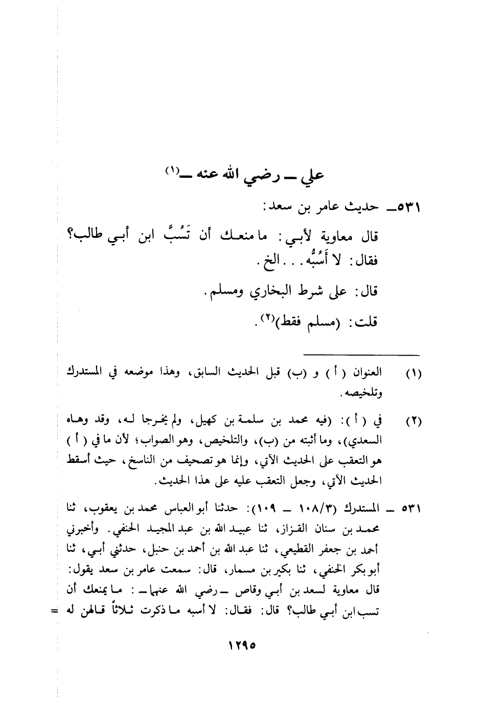 531 - المستدرك (3/ 108 - 109): حدثنا أبو العباس محمد بن يعقوب، ثنا محمد بن سنان القزاز، ثنا عبيد الله بن عبد المجيد الحنفي. وأخبرني أحمد بن جعفر القطيعي، ثنا عبد الله بن أحمد بن حنبل، حدثني أبي، ثنا أبو بكر الخنفي، ثنا بكير بن مسمار، قال: سمعت عامر بن سعد يقول: قال معاوية لسعد بن أبي وقاص -رضي الله عنهما-: ما يمنعك أن تسب ابن أبي طالب؟ قال: فقال: لا أسبه ما ذكرت ثلاثاً قالهن له =
