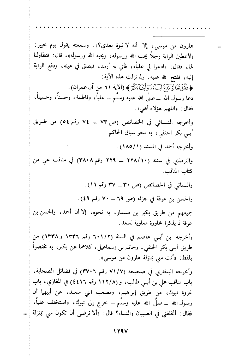= هارون من موسى، إلا أنه لا نبوة بعدي؟ ". وسمعته يقول يوم خيبر: "لأعطين الراية رجلًا يحب الله ورسوله، ويحبه الله ورسوله"، قال: فتطاولنا لها، فقال: "ادعوا لي علياً"، فأتي به أرمد، فبصق في عينه، ودفع الراية إليه، ففتح الله عليه. ولما نزلت هذه الآية: