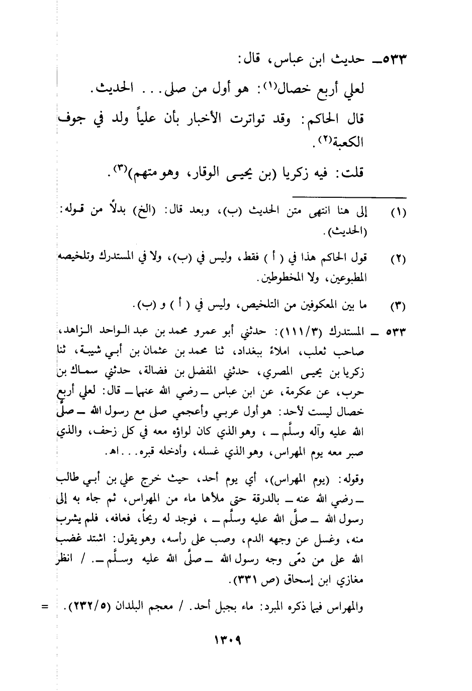 533 - المستدرك (3/ 111): حدثني أبو عمرو محمد بن عبد الواحد الزاهد، صاحب ثعلب، املاءً ببغداد، ثنا محمد بن عثمان بن أبي شيبة، ثنا زكريا بن يحيى المصري، حدثني المفضل بن فضالة، حدثني سماك بن حرب، عن عكرمة، عن ابن عباس -رضي الله عنهما- قال: لعلي أربع خصال ليست لأحد: هو أول عربي وأعجمي صلى مع رسول الله -صلى الله عليه وآله وسلم-، وهو الذي كان لواؤه معه في على زحف، والذي صبر معه يوم المهراس، وهو الذي غسله، وأدخله قبره ... اهـ.