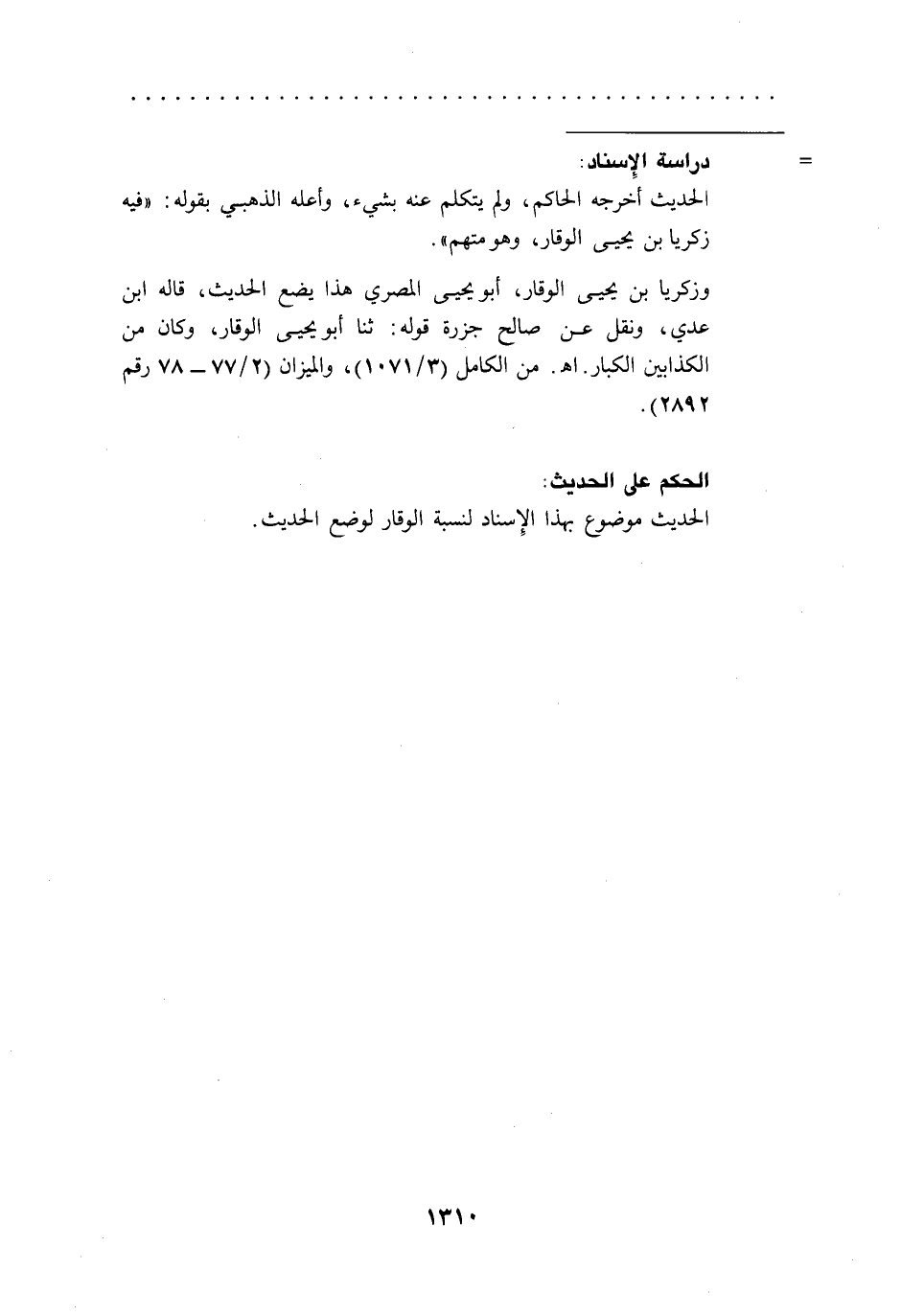 وزكريا بن يحيى الوقار، أبو يحيى المصري هذا يضع الحديث، قاله ابن عدي، ونقل عن صالح جزرة قوله: ثنا أبو يحيى الوقار، وكان من الكذابين الكبار. اهـ. من الكامل (3/ 1071)، والميزان (2/ 77 - 78 رقم 2892).