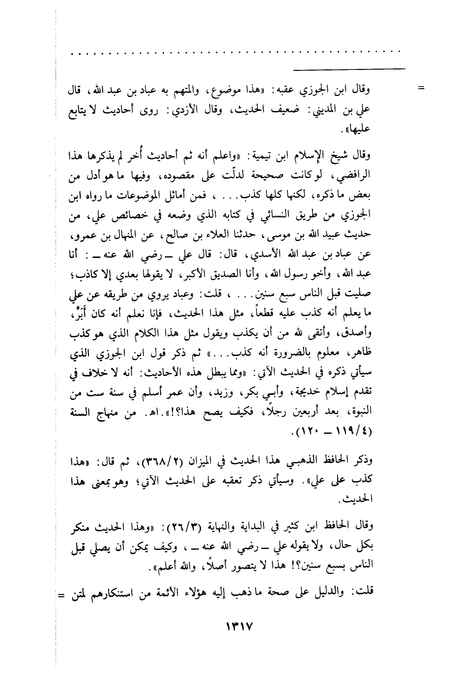 وقال شيخ الِإسلام ابن تيمية: "واعلم أنه ثم أحاديث أُخر لم يذكرها هذا الرافضي، لو كانت صحيحة لدلّت على مقصوده، وفيها ما هو أدل من بعض ما ذكره، لكنها كلها كذب ... ، فمن أماثل الموضوعات ما رواه ابن الجوزي من طريق النسائي في كتابه الذي وضعه في خصائص علي، من حديث عبيد الله بن موسى، حدثنا العلاء بن صالح، عن المنهال بن عمرو، عن عباد بن عبد الله الأسدي، قال: قال علي -رضي الله عنه-: أنا عبد الله، وأخو رسول الله، وأنا الصديق الأكبر، لا يقولها بعدي إلا كاذب؛ صليت قبل الناس سبع سنين ... ، قلت: وعباد يروي من طريقه عن علي ما يعلم أنه كذب عليه قطعاً، مثل هذا الحديث، فإنا نعلم أنه كان أَبَرّ، وأصدق، وأتقى لله من أن يكذب ويقول مثل هذا الكلام الذي هو كذب ظاهر، معلوم بالضرورة أنه كذب ... " ثم ذكر قول ابن الجوزي الذي سيأتي ذكره في الحديث الآتي: "ومما يبطل هذه الأحاديث: أنه لا خلاف في تقدم إسلام خديجة، وأبي بكر، وزيد، وأن عمر أسلم في سنة ست من النبوة، بعد أربعين رجلاً، فكيف يصح هذا؟! ". اهـ. من منهاج السنة (4/ 119 - 120).