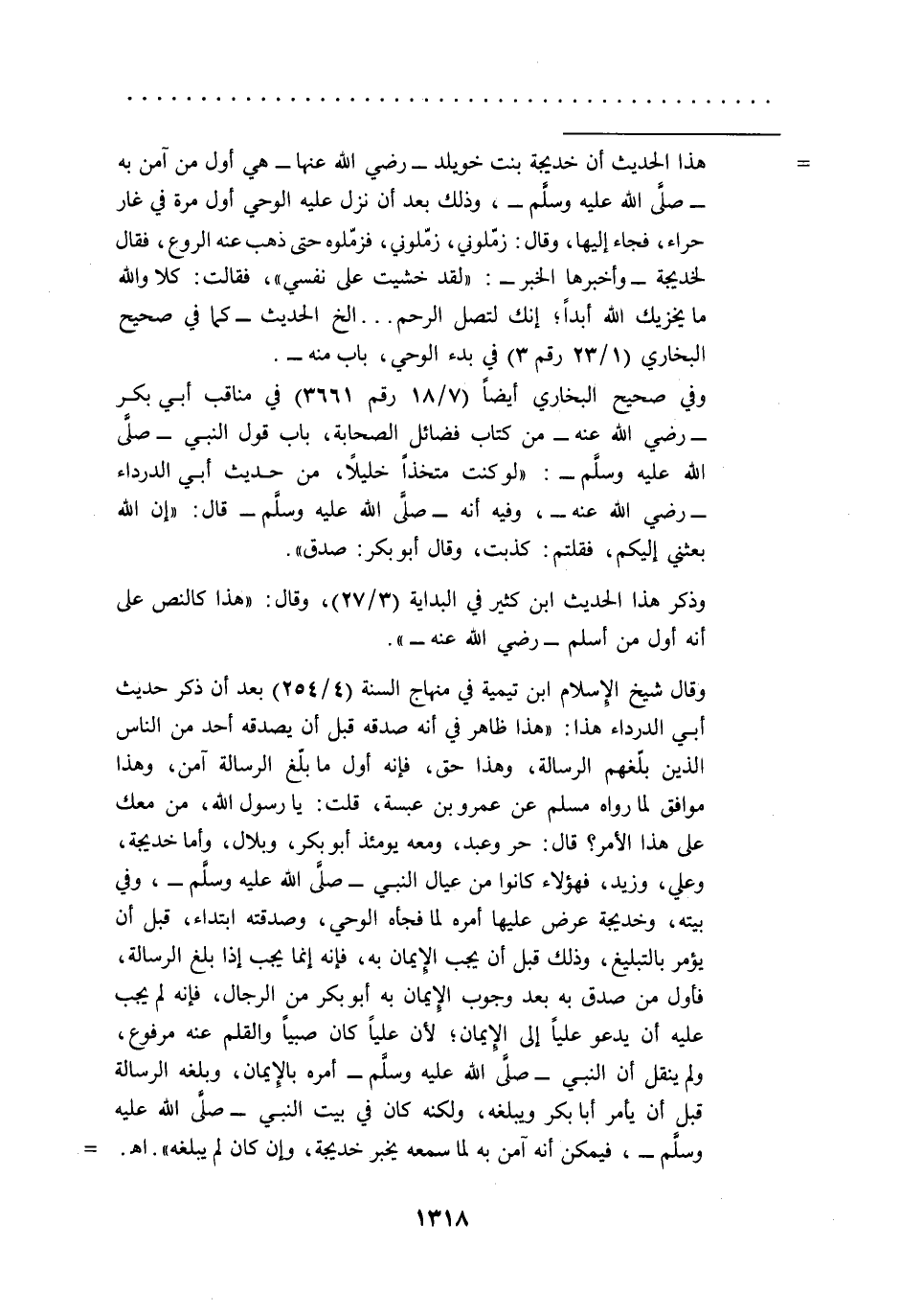 وقال شيخ الإسلام ابن تيمية في منهاج السنة (254/ 4) بعد أن ذكر حديث أبي الدرداء هذا: "هذا ظاهر في أنه صدقه قبل أن يصدقه أحد من الناس الذين بلّغهم الرسالة، وهذا حق، فإنه أول ما بلّغ الرسالة آمن، وهذا موافق لما رواه مسلم عن عمرو بن عبسة، قلت: يا رسول الله، من معك على هذا الأمر؟ قال: حر وعبد، ومعه يومئذ أبو بكر، وبلال، وأما خديجة، وعلي، وزيد، فهؤلاء كانوا من عيال النبي -صلى الله عليه وسلم-، وفي بيته، وخديجة عرض عليها أمره لما فجأه الوحي، وصدقته ابتداء، قبل أن يؤمر بالتبليغ، وذلك قبل أن يجب الإيمان به، فإنه إنما يجب إذا بلغ الرسالة، فأول من صدق به بعد وجوب الِإيمان به أبو بكر من الرجال، فإنه لم يجب عليه أن يدعو علياً إلى الإيمان؛ لأن علياً كان صبياً والقلم عنه مرفوع، ولم ينقل أن النبي -صلى الله عليه وسلم- أمره بالإِيمان، وبلغه الرسالة قبل أن يأمر أبا بكر ويبلغه، ولكنه كان في بيت النبي -صلى الله عليه وسلم-، فيمكن أنه آمن به لما سمعه يخبر خديجة، وإن كان لم يبلغه". اهـ. =