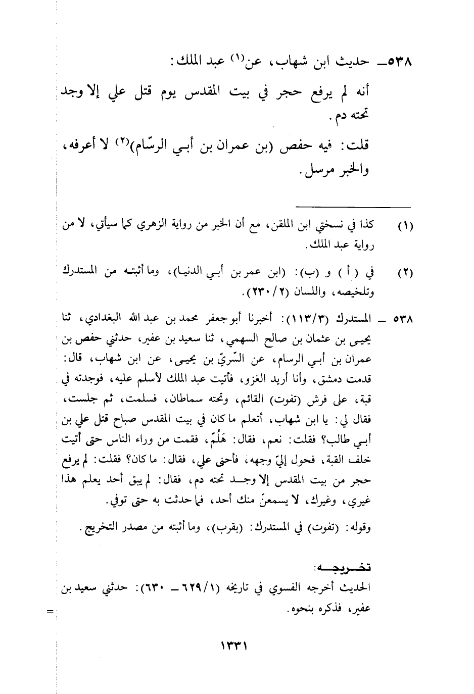 538 - المستدرك (3/ 113): أخبرنا أبو جعفر محمد بن عبد الله البغدادي، ثنا يحيى بن عثمان بن صالح السهمي، ثنا سعيد بن عفير، حدثني حفص بن عمران بن أبي الرسام، عن السري بن يحيى، عن ابن شهاب، قال: قدمت دمشق، وأنا أريد الغزو، فأتيت عبد الملك لأسلم عليه، فوجدته في قبة، على فرش (تفوت) القائم، وتحته سماطان، فسلمت، ثم جلست، فقال لي: يا ابن شهاب، أتعلم ما كان في بيت المقدس صباح قتل علي بن أبي طالب؟ فقلت: نعم، فقال: هَلُمّ، فقمت من وراء الناس حتى أتيت خلف القبة، فحول إليّ وجهه، فأحنى علي، فقال: ما كان؟ فقلت: لم يرفع حجر من بيت المقدس إلا وجد تحته دم، فقال: لم يبق أحد يعلم هذا غيري، وغيرك، لا يسمعنّ منك أحد، فما حدثت به حتى توفي.