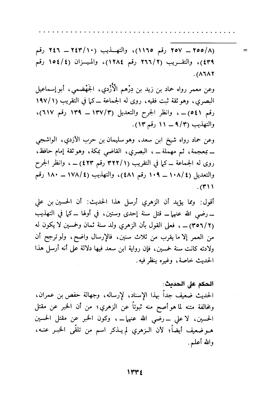 أقول: ومما يؤيد أن الزهري أرسل هذا الحديث: أن الحسين بن علي -رضي الله عنهما- قتل سنة إحدى وستين، في أولها -كما في التهذيب (2/ 356) -، فعلى القول بأن الزهري ولد سنة ثمان وخمسين لا يكون له من العمر إلا ما يقرب من ثلاث سنين، فالِإرسال واضح، ولو ترجح أن ولادته كانت سنة خمسين، فإن رواية ابن سعد فيها دلالة على أنه أرسل هذا الحديث خاصة، وغيره ينظر فيه.
