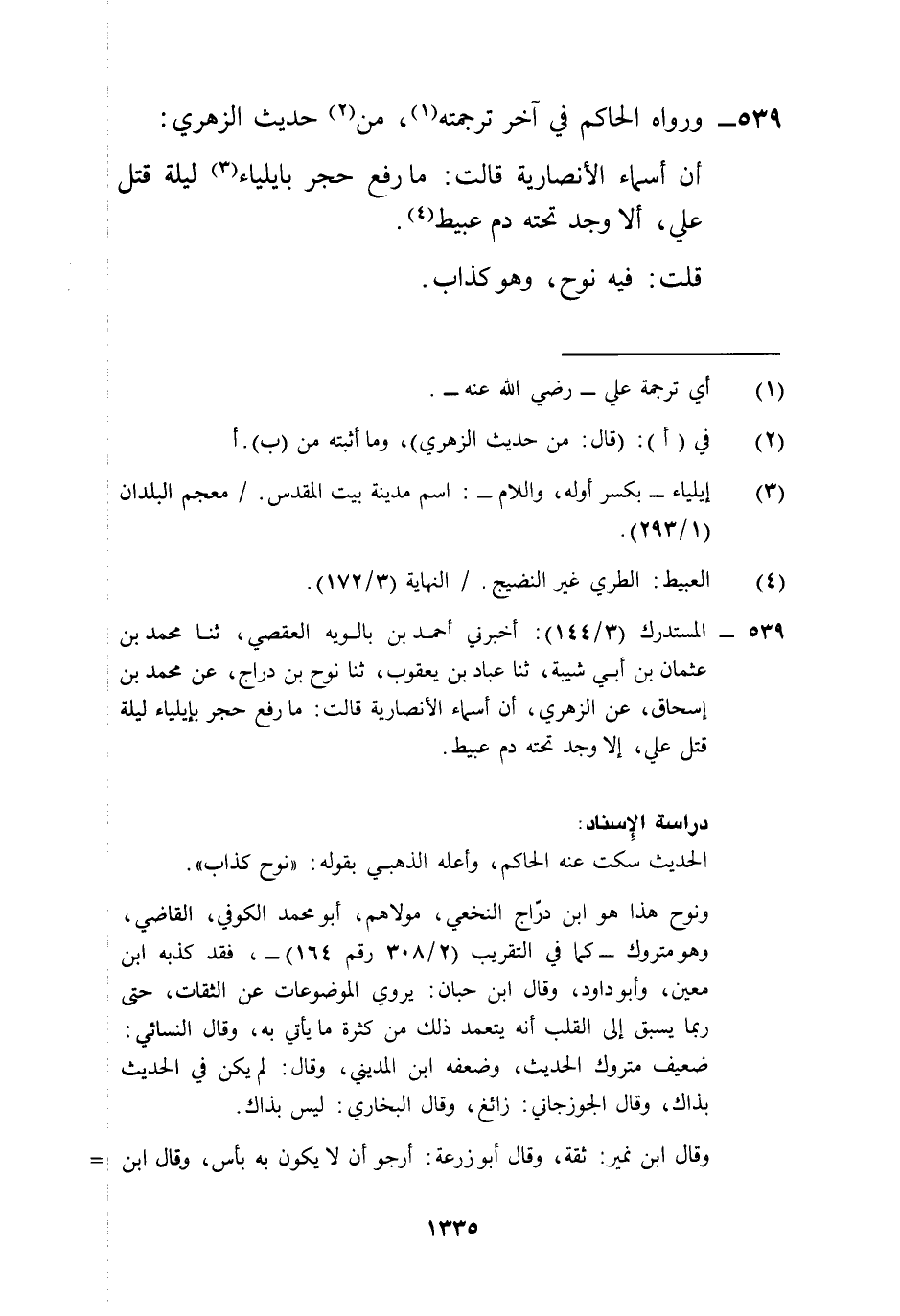 539 - المستدرك (3/ 144): أخبرني أحمد بن بالويه العقصي، ثنا محمد بن عثمان بن أبي شيبة، ثنا عباد بن يعقوب، ثنا نوح بن دراج، عن محمد بن إسحاق، عن الزهري، أن أسماء الأنصارية قالت: ما رفع حجر بإيلياء ليلة قتل علي، إلا وجد تحته دم عبيط.