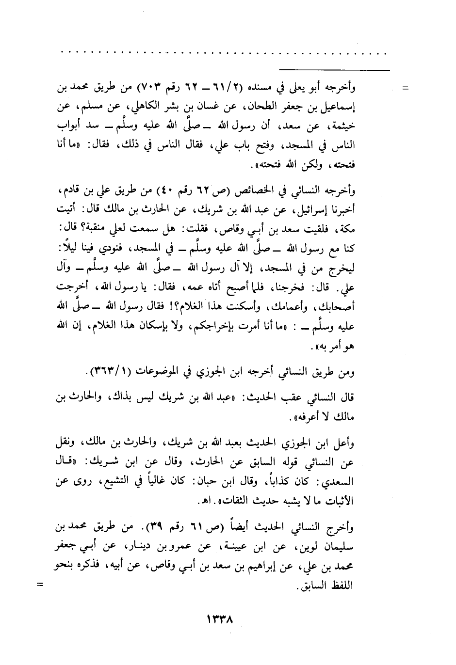 وأخرجه النسائي في الخصائص (ص 62 رقم 40) من طريق علي بن قادم، أخبرنا إسرائيل، عن عبد الله بن شريك، عن الحارث بن مالك قال: أتيت مكة، فلقيت سعد بن أبي وقاص، فقلت: هل سمعت لعلي منقبة؟ قال: كنا مع رسول الله -صلَّى الله عليه وسلم- في المسجد، فنودي فينا ليلاً: ليخرج من في المسجد، إلا آل رسول الله -صلَّى الله عليه وسلم- وآل علي. قال: فخرجنا، فلما أصبح أتاه عمه، فقال: يا رسول الله، أخرجت أصحابك، وأعمامك، وأسكنت هذا الغلام؟! فقال رسول الله -صلَّى الله عليه وسلم-: "ما أنا أمرت بإخراجكم، ولا بإسكان هذا الغلام، إن الله هو أمر به".