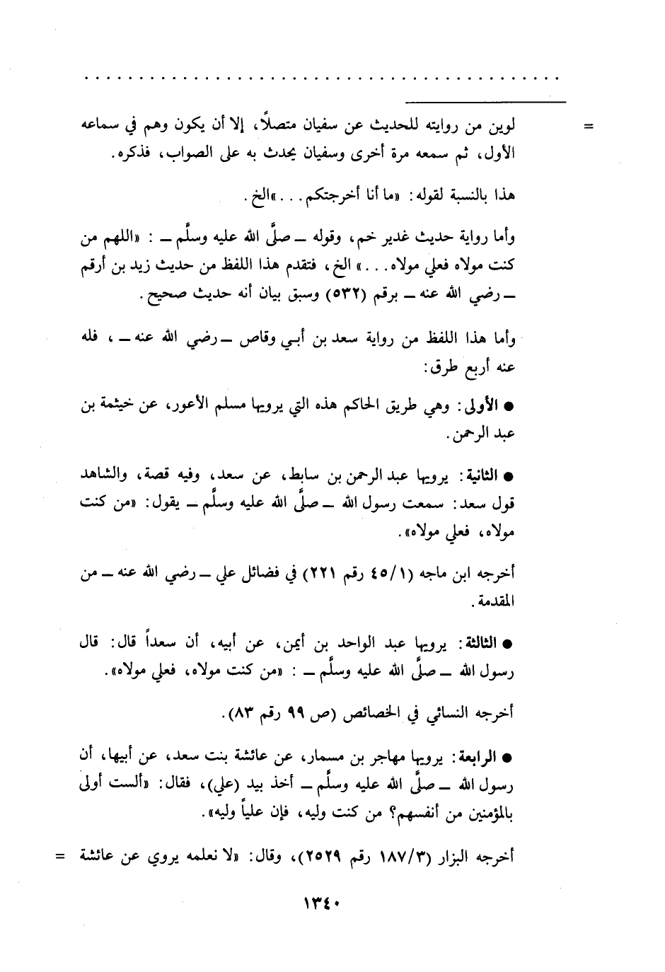 وأما رواية حديث غدير خم، وقوله -صلى الله عليه وسلم-: "اللهم من كنت مولاه فعلي مولاه ... " الخ، فتقدم هذا اللفظ من حديث زيد بن أرقم -رضي الله عنه- برقم (532) وسبق بيان أنه حديث صحيح.