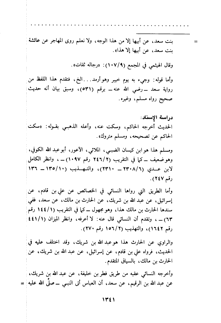 وأما الطريق التي رواها النسائي في الخصائص عن علي بن قادم، عن إسرائيل، عن عبد الله بن شريك، عن الحارث بن مالك، عن سعد، ففي سندها الحارث بن مالك هذا، وهو مجهول -كما في التقريب (1/ 144رقم 63) -، وتقدم أن النسائي قال عنه: لا أعرفه، وانظر الميزان (1/ 441 رقم 1642)، والتهذيب (2/ 156 رقم 270).