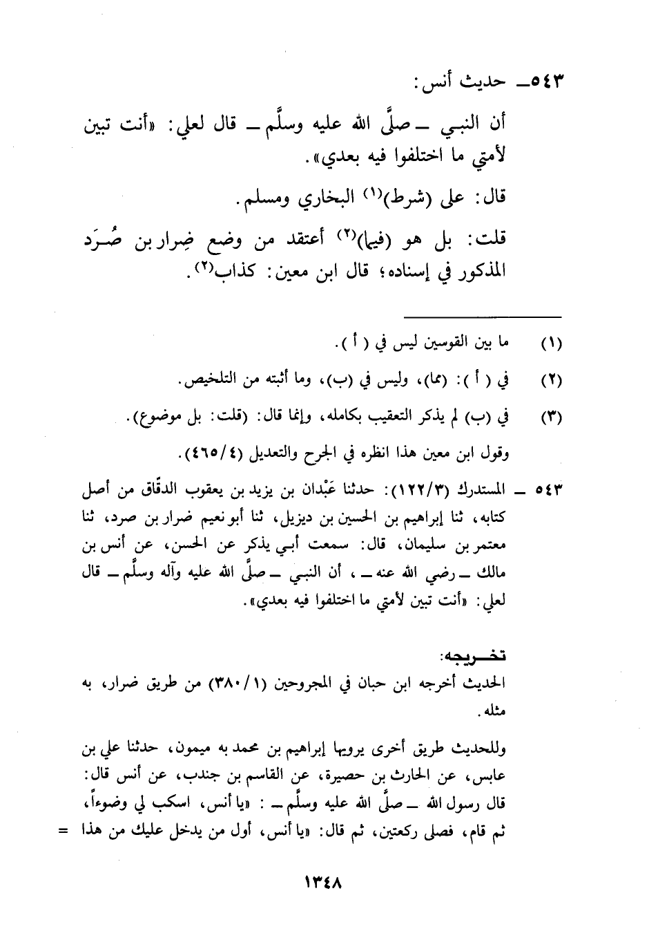 543 - المستدرك (3/ 122): حدثنا عَبْدان بن يزيد بن يعقوب الدقّاق من أصل كتابه، ثنا إبراهيم بن الحسين بن ديزيل، ثنا أبو نعيم ضرار بن صرد، ثنا معتمر بن سليمان، قال: سمعت أبي يذكر عن الحسن، عن أنس بن مالك -رضي الله عنه-، أن النبي -صلى الله عليه وآله وسلم- قال لعلي: "أنت تبين لأمتي ما اختلفوا فيه بعدي".