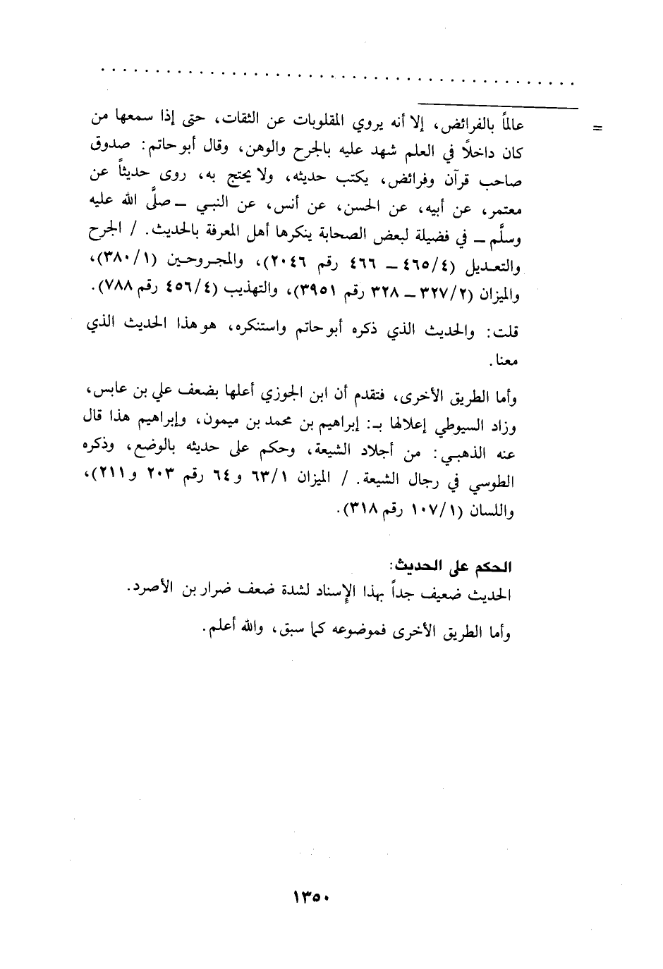 = عالماً بالفرائض، إلا أنه يروي المقلوبات عن الثقات، حتى إذا سمعها من كان داخلًا في العلم شهد عليه بالجرح والوهن، وقال أبو حاتم: صدوق صاحب قرآن وفرائض، يكتب حديثه، ولا يحتج به، روى حديثاً عن معتمر، عن أبيه، عن الحسن، عن أنس، عن النبي -صلى الله عليه وسلم- في فضيلة لبعض الصحابة ينكرها أهل المعرفة بالحديث./ الجرح والتعديل (4/ 465 - 466 رقم2046)، والمجروحين (1/ 380)، والميزان (2/ 327 - 328 رقم3951)، والتهذيب (4/ 456رقم788).
