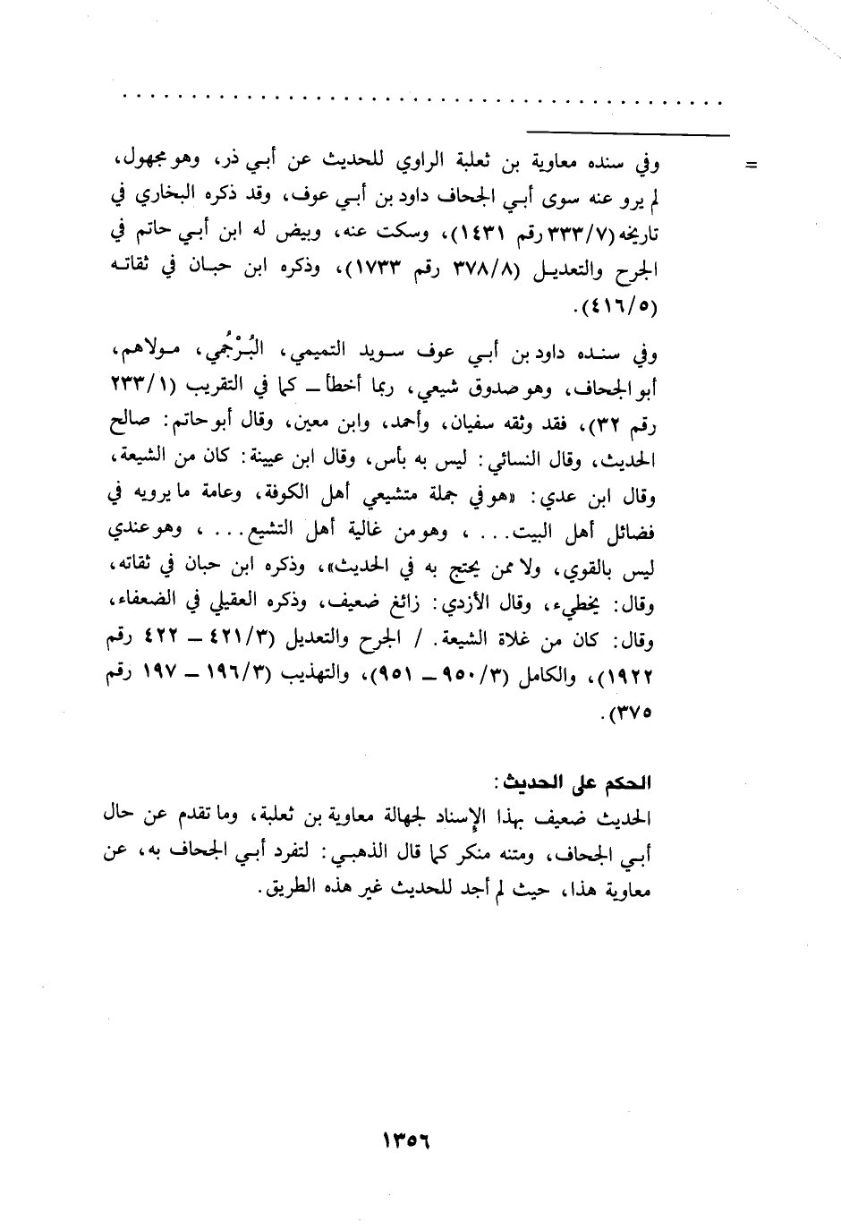 وفي سنده داود بن أبي عوف سويد التميمي، البُرْجُمي، مولاهم، أبو الجحاف، وهو صدوق شيعي، ربما أخطأ -كما في التقريب (1/ 233 رقم 32)، فقد وثقه سفيان، وأحمد، وابن معين، وقال أبو حاتم: صالح الحديث، وقال النسائي: ليس به بأس، وقال ابن عيينة: كان من الشيعة، وقال ابن عدي: "هو في جملة متشيعي أهل الكوفة، وعامة ما يرويه في فضائل أهل البيت ... ، وهو من غالية أهل التشيع ... ، وهو عندي ليس بالقوي، ولا ممن يحتج به في الحديث"، وذكره ابن حبان في ثقاته، وقال: يخطيء، وقال الأزدي: زائغ ضعيف، وذكره العقيلي في الضعفاء، وقال: كان من غلاة الشيعة./ الجرح والتعديل (3/ 421 - 422رقم 1922)، والكامل (3/ 950 - 951)، والتهذيب (3/ 196 - 197 رقم 375).