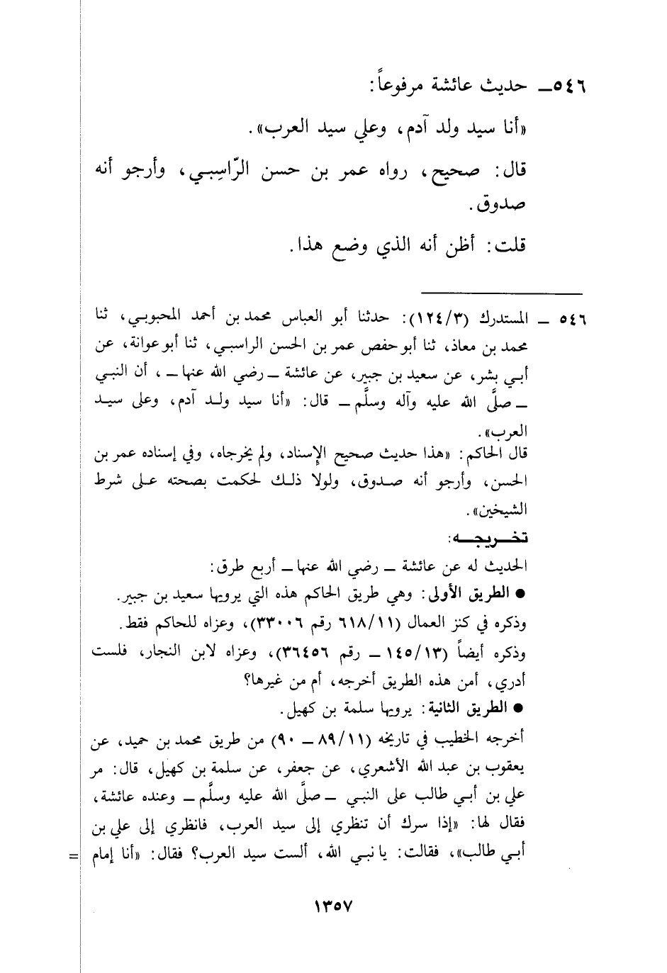 546 - المستدرك (3/ 124): حدثنا أبو العباس محمد بن أحمد المحبوبي، ثنا محمد بن معاذ، ثنا أبو حفص عمر بن الحسن الراسبي، ثنا أبو عوانة، عن أبي بشر، عن سعيد بن جبير، عن عائشة -رضي الله عنها-، أن النبي -صلى الله عليه وآله وسلم- قال: "أنا سيد ولد آدم، وعلى سيد العرب".