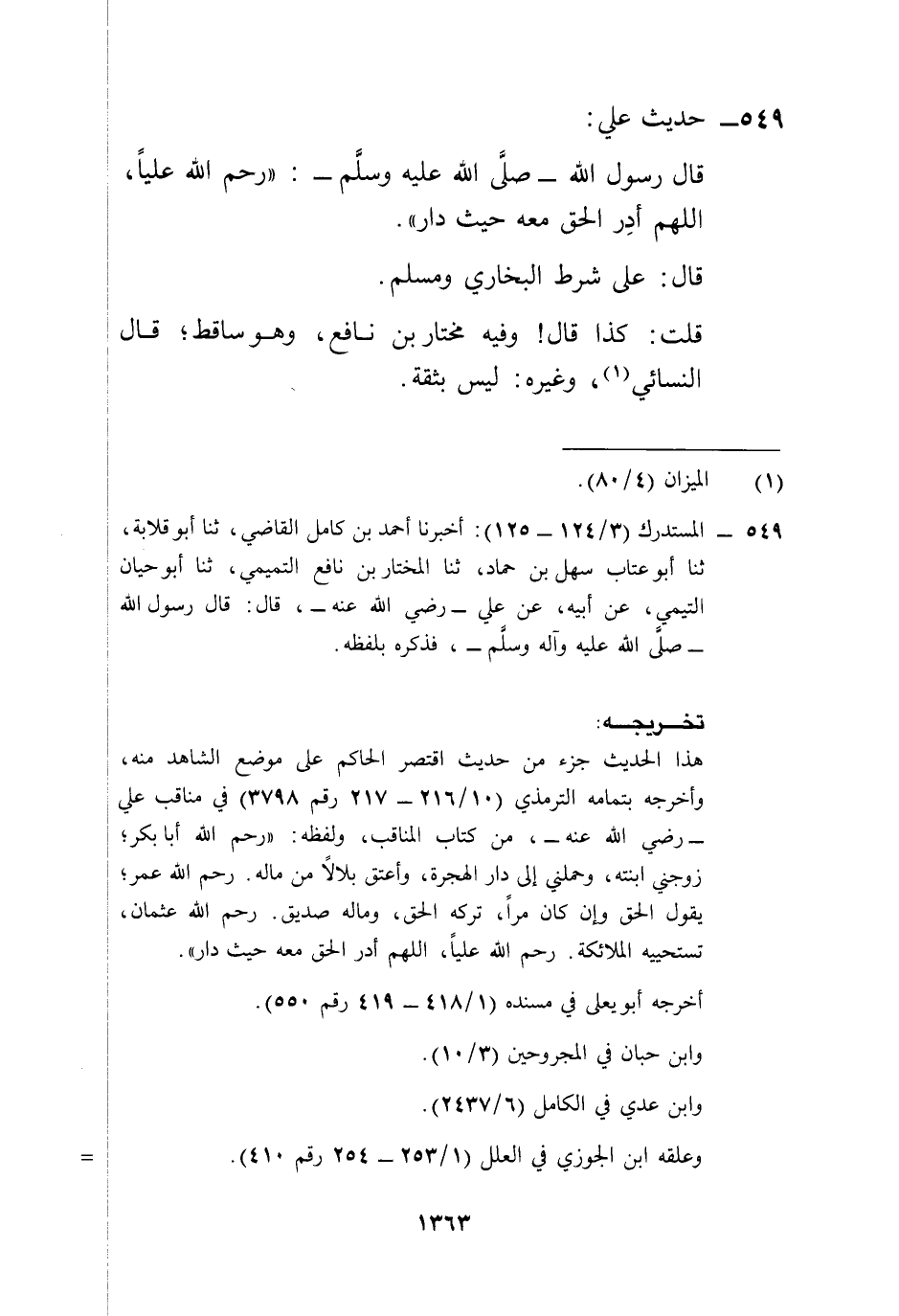 549 - المستدرك (3/ 124 - 125): أخبرنا أحمد بن كامل القاضي، ثنا أبو قلابة، ثنا أبو عتاب سهل بن حماد، ثنا المختار بن نافع بالتميمي، ثنا أبو حيان التيمي، عن أبيه، عن علي -رضي الله عنه-، قال: قال رسول الله -صلى الله عليه وآله وسلم-، فذكره بلفظه.