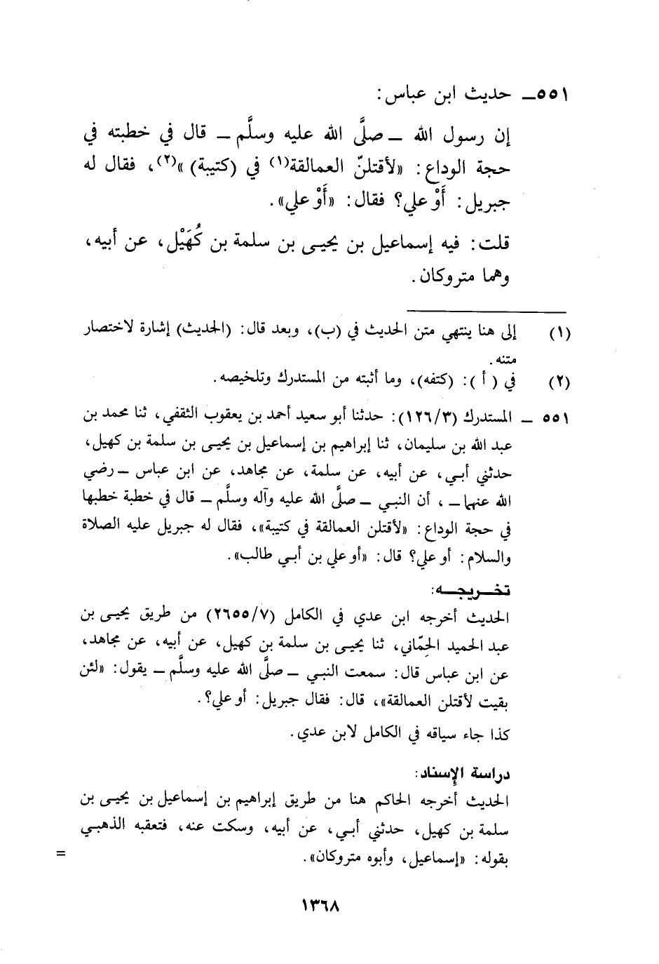551 - المستدرك (3/ 126): حدثنا أبو سعيد أحمد بن يعقوب الثقفي، ثنا محمد بن عبد الله بن سليمان، ثنا إبراهيم بن إسماعيل بن يحيى بن سلمة بن كهيل، حدثني أبي، عن أبيه، عن سلمة، عن مجاهد، عن ابن عباس -رضي الله عنهما-، أن النبي -صلى الله عليه وآله وسلَّم- قال في خطبة خطبها في حجة الوداع: "لأقتلن العمالقة في كتيبة"، فقال له جبريل عليه الصلاة والسلام: أو علي؟ قال: "أو علي بن أبي طالب".