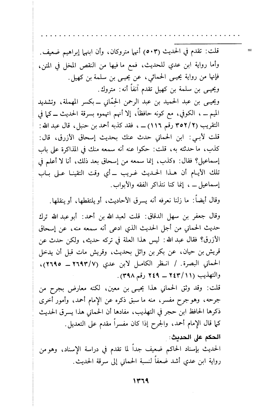 ويحيى بن عبد الحميد بن عبد الرحمن الحِمّاني -بكسر المهملة، وتشديد الميم-، الكوفي، مع كونه حافظاً، إلا أنهم اتهموه بسرقة الحديث -كما في التقريب (2/ 352رقم 116) -، فقد كذبه أحمد بن حنبل، قال عبد الله: قلت لأبي: ابن الحماني حدث عنك بحديث إسحاق الأزرق، قال: كذب، ما حدثته به، قلت: حكوا عنه أنه سمعه منك في المذاكرة على باب إسماعيل؟ فقال: "كذب، إنما سمعه من إسحاق بعد ذلك، أنا لا أعلم في تلك الأيام أن هذا الحديث غريب -أي وقت التقينا على باب إسماعيل-، إنما كنا نتذاكر الفقه والأبواب.