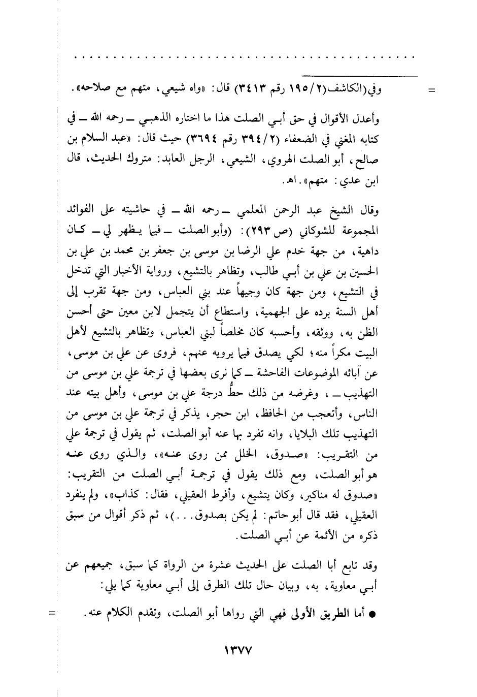 وقال الشيخ عبد الرحمن المعلمي -رحمه الله- في حاشيته على الفوائد المجموعة للشوكاني (ص 293): (وأبو الصلت -فيما يظهر لي- كان داهية، من جهة خدم علي الرضا بن موسى بن جعفر بن محمد بن علي بن الحسين بن علي بن أبي طالب، وتظاهر بالتشيع، ورواية الأخبار التي تدخل في التشيع، ومن جهة كان وجيهاً عند بني العباس، ومن جهة تقرب إلى أهل السنة برده على الجهمية، واستطاع أن يتجمل لابن معين حتى أحسن الظن به، ووثقه، وأحسبه كان مخلصاً لبني العباس، وتظاهر بالتشيع لأهل البيت مكراً منه؛ لكي يصدق فيما يرويه عنهم، فروى عن علي بن موسى، عن آبائه الموضوعات الفاحشة -كما نرى بعضها في ترجمة علي بن موسى من التهذيب-، وغرضه من ذلك حطّ درجة علي بن موسى، وأهل بيته عند الناس، وأتعجب من الحافظ، ابن حجر، يذكر في ترجمة علي بن موسى من التهذيب تلك البلايا، وإنه تفرد بها عنه أبو الصلت، ثم يقول في ترجمة علي من التقريب: "صدوق، الخلل ممن روى عنه"، والذي روى عنه هو أبو الصلت، ومع ذلك يقول في ترجمة أبي الصلت من التقريب: "صدوق له مناكير، وكان يتشيع، وأفرط العقيلي، فقال: كذاب"، ولم ينفرد العقيلي، فقد قال أبو حاتم: لم يكن بصدوق ... )، ثم ذكر أقوال من سبق ذكره من الأئمة عن أبي الصلت.