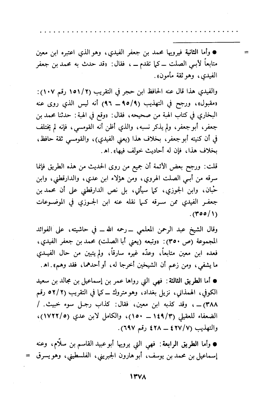 وقال الشيخ عبد الرحمن المعلمي -رحمه الله- في حاشيته، على الفوائد المجموعة (ص 350): "وتبعه (يعني أبا الصلت) محمد بن جعفر الفيدي، فعده ابن معين متابعاً، وعدّه غيره سارقاً، ولم يتبين من حال الفيدي ما يشفي، ومن زعم أن الشيخين أخرجا له، أو أحدهما، فقد وهم". اهـ.
