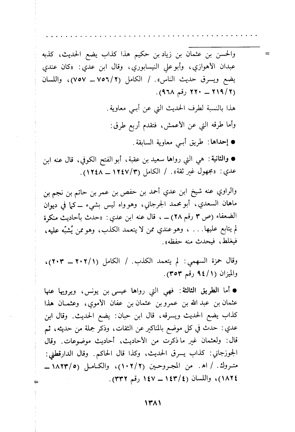 * أما الطريق الثالثة: فهي التي رواها عيسى بن يونس، ويرويها عنها عثمان بن عبد الله بن عمرو بن عثمان بن عفان الأموي، وعثمان هذا كذاب يضع الحديث ويسرقه، قال ابن حبان: يضع الحديث. وقال ابن عدي: حدث في كل موضع بالمناكير عن الثقات، وذكر جملة من حديثه، ثم قال: ولعثمان غير ما ذكرت من الأحاديث، أحاديث موضوعات. وقال الجوزجاني: كذاب يسرق الحديث، وكذا قال الحاكم. وقال الدارقطني: متروك./ اهـ. من المجروحين (2/ 102)، والكامل (5/ 1823 - 1824)، واللسان (4/ 143 - 147رقم 332). =