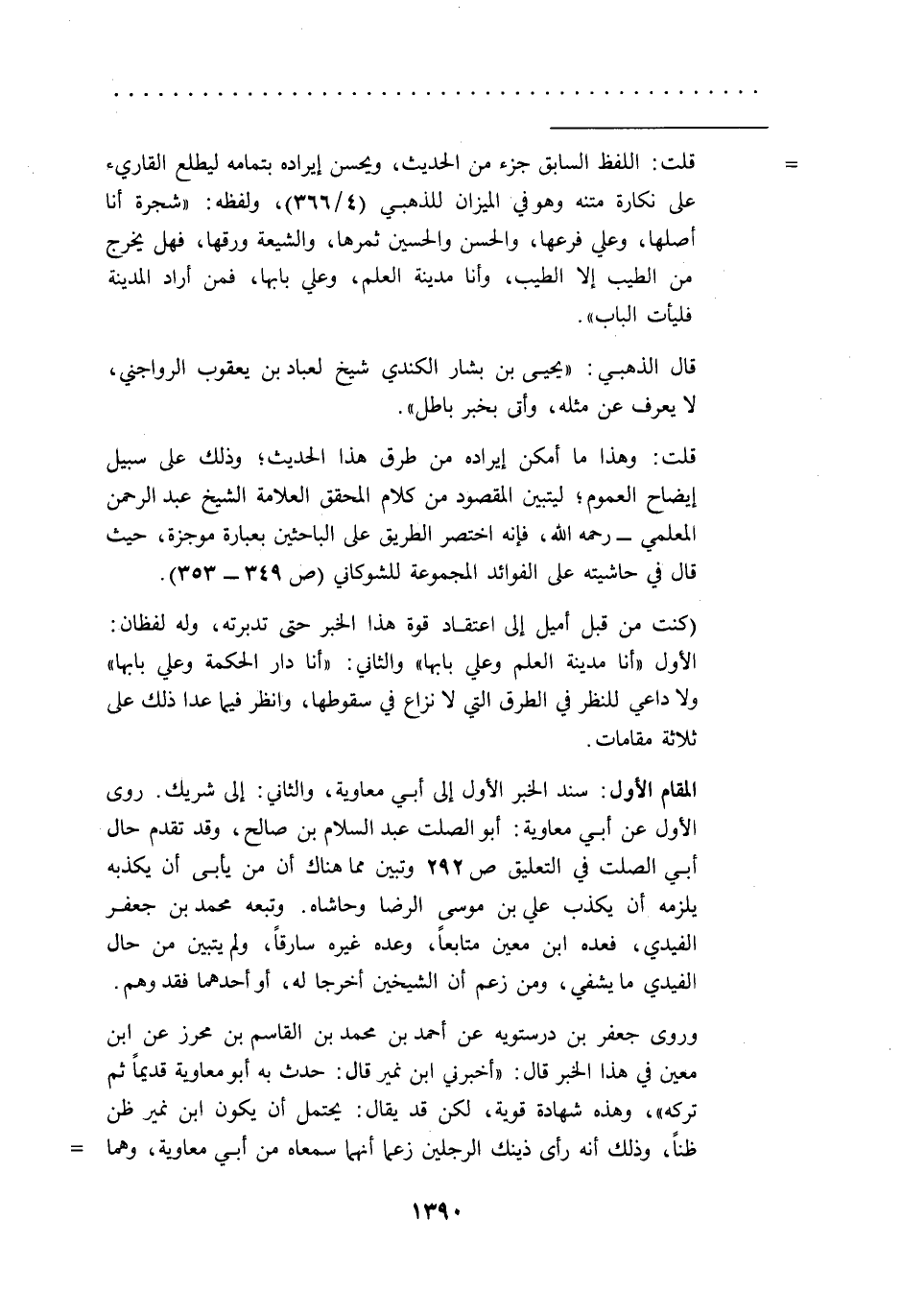 (كنت من قبل أميل إلى اعتقاد قوة هذا الخبر حتى تدبرته، وله لفظان: الأول "أنا مدينة العلم وعلي بابها" والثاني: "أنا دار الحكمة وعلي بابها" ولا داعي للنظر في الطرق التي لا نزاع في سقوطها، وانظر فيما عدا ذلك على ثلاثة مقامات.