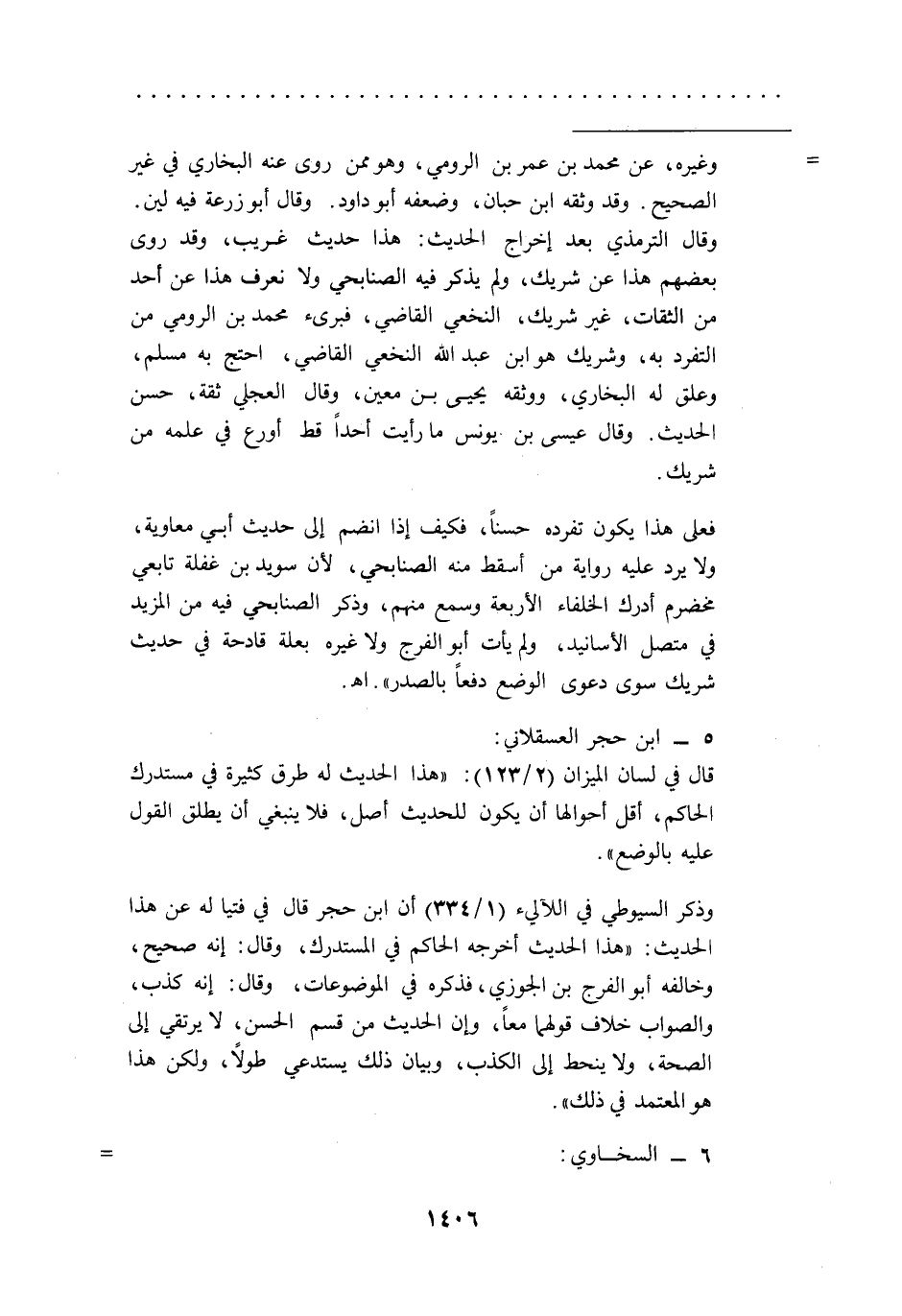 فعلى هذا يكون تفرده حسناً، فكيف إذا انضم إلى حديث أبي معاوية، ولا يرد عليه رواية من أسقط منه الصنابحي، لأن سويد بن غفلة تابعي مخضرم أدرك الخلفاء الأربعة وسمع منهم، وذكر الصنابحي فيه من المزيد في متصل الأسانيد، ولم يأت أبو الفرج ولا غيره بعلة قادحة في حديث شريك سوى دعوى الوضع دفعاً بالصدر". اهـ.