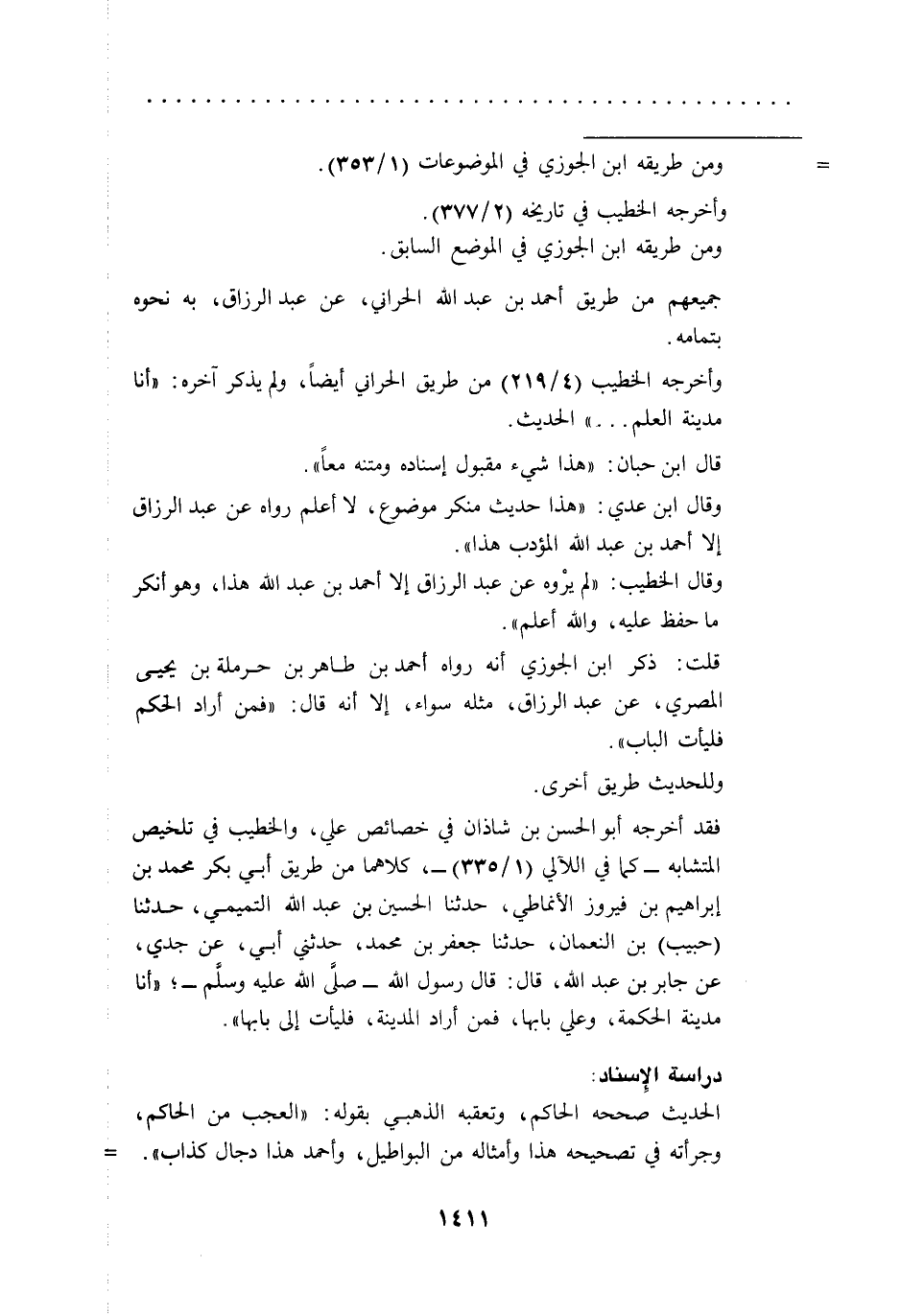قلت: ذكر ابن الجوزي أنه رواه أحمد بن طاهر بن حرملة بن يحيى المصري، عن عبد الرزاق، مثله سواء، إلا أنه قال: "فمن أراد الحكم فليأت الباب".
