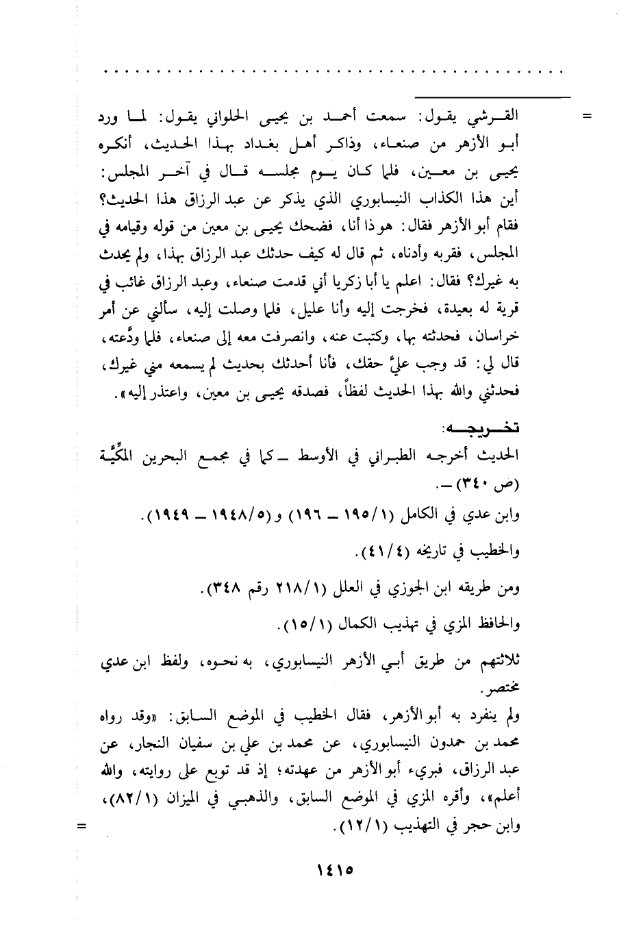 = القرشي يقول: سمعت أحمد بن يحيى الحلواني يقول: لما ورد أبو الأزهر من صنعاء، وذاكر أهل بغداد بهذا الحديث، أنكره يحيى بن معين، فلما كان يوم مجلسه قال في آخر المجلس: أين هذا الكذاب النيسابوري الذي يذكر عن عبد الرزاق هذا الحديث؟ فقام أبو الأزهر فقال: هو ذا أنا، فضحك يحيى بن معين من قوله وقيامه في المجلس، فقربه وأدناه، ثم قال له كيف حدثك عبد الرزاق بهذا، ولم يحدث به غيرك؟ فقال: اعلم يا أبا زكريا أني قدمت صنعاء، وعبد الرزاق غائب في قرية له بعيدة، فخرجت إليه وأنا عليل، فلما وصلت إليه، سألني عن أمر خراسان، فحدثته بها، وكتبت عنه، وانصرفت معه إلى صنعاء، فلما ودعته، قال لي: قد وجب عليَّ حقك، فأنا أحدثك بحديث لم يسمعه مني غيرك، فحدثني والله بهذا الحديث لفظاً، فصدقه يحيى بن معين، واعتذر إليه".