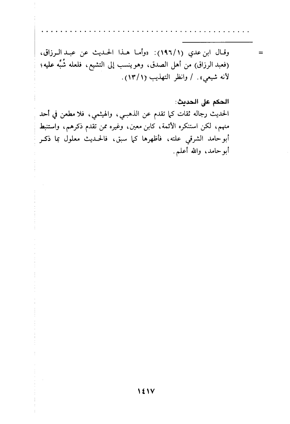 = وقال ابن عدي (1/ 196): "وأما هذا الحديث عن عبد الرزاق، (فعبد الرزاق) من أهل الصدق، وهو ينسب إلى التشيع، فلعله شُبِّه عليه، لأنه شيعي"./ وانظر التهذيب (1/ 13).