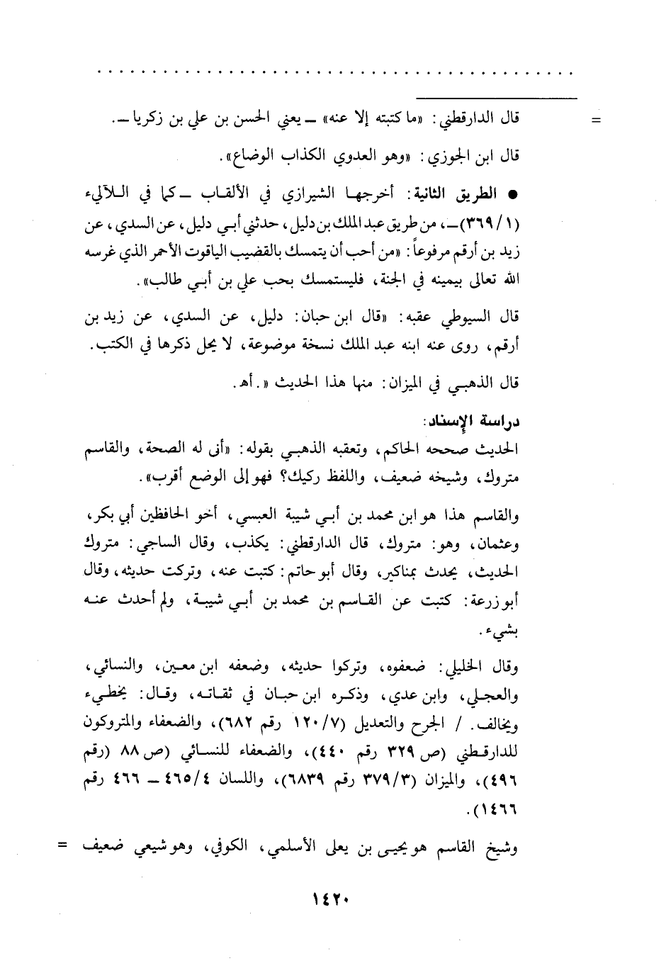 وقال الخليلي: ضعفوه، وتركوا حديثه، وضعفه ابن معين، والنسائي، والعجلي، وابن عدي، وذكره ابن حبان في ثقاته، وقال: يخطيء ويخالف./ الجرح والتعديل (7/ 120رقم 682)، والضعفاء والمتروكون للدارقطني (ص 329 رقم 440)، والضعفاء للنسائي (ص 88 (رقم 496)، والميزان (3/ 379 رقم6839)، واللسان 4/ 465 - 466 رقم 1466).