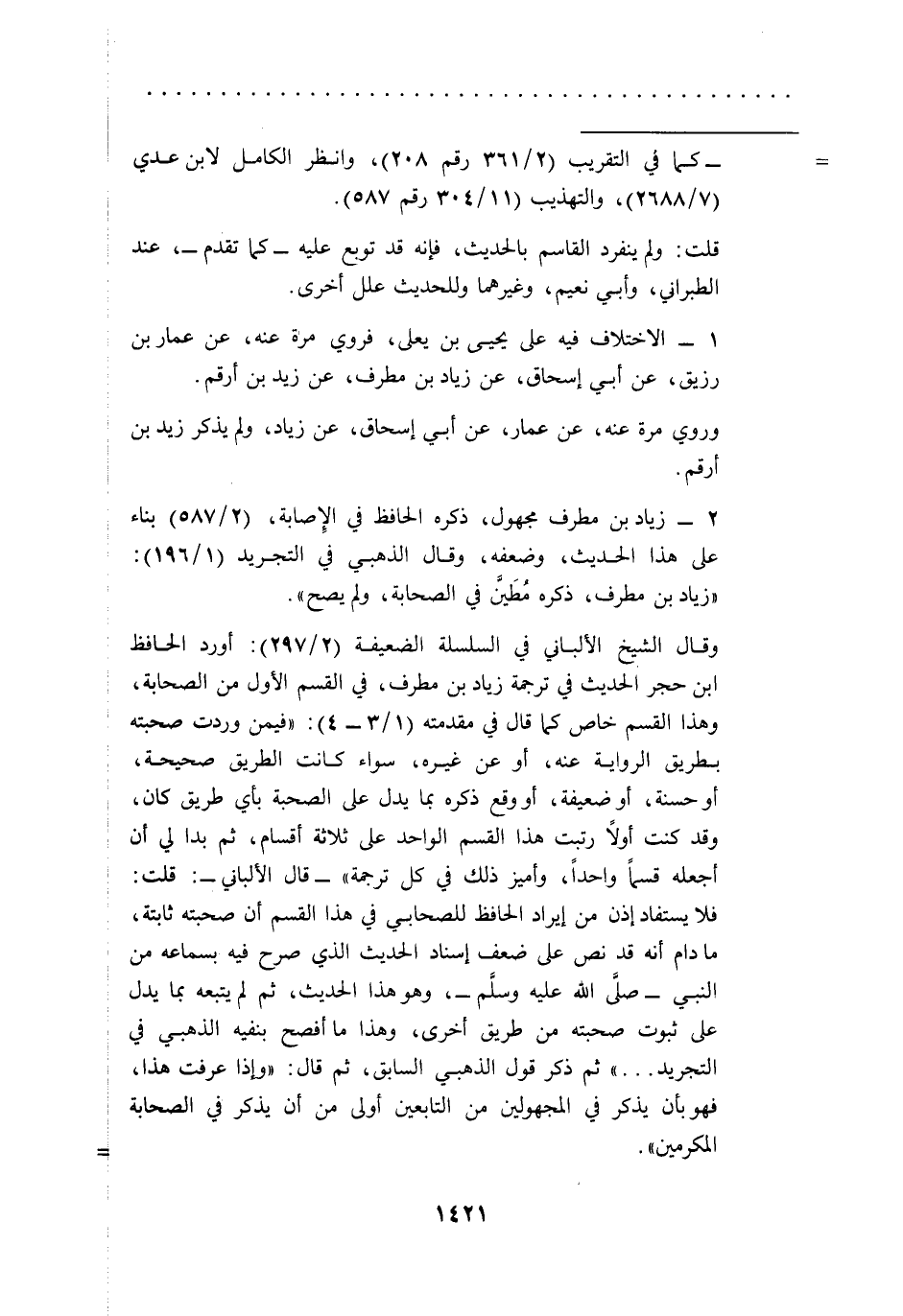وقال الشيخ الألباني في السلسلة الضعيفة (2/ 297): أورد الحافظ ابن حجر الحديث في ترجمة زياد بن مطرف، في القسم الأول من الصحابة، وهذا القسم خاص كما قال في مقدمته (1/ 3 - 4): "فيمن وردت صحبته بطريق الرواية عنه، أو عن غيره، سواء كانت الطريق صحيحة، أو حسنة، أو ضعيفة، أو وقع ذكره بما يدل على الصحبة بأي طريق كان، وقد كنت أولاً رتبت هذا القسم الواحد على ثلاثة أقسام، ثم بدا لي أن أجعله قسماً واحداً، وأميز ذلك في على ترجمة" -قال الألباني-. قلت: فلا يستفاد إذن من إيراد الحافظ للصحابي في هذا القسم أن صحبته ثابتة، ما دام أنه قد نص على ضعف إسناد الحديث الذي صرح فيه بسماعه من النبي -صلى الله عليه وسلم-، وهو هذا الحديث، ثم لم يتبعه بما يدل على ثبوت صحبته من طريق أخرى، وهذا ما أفصح بنفيه الذهبي في التجريد ... " ثم ذكر قول الذهبي السابق، ثم قال: "وإذا عرفت هذا، فهو بأن يذكر في المجهولين من التابعين أولى من أن يذكر في الصحابة المكرمين". =
