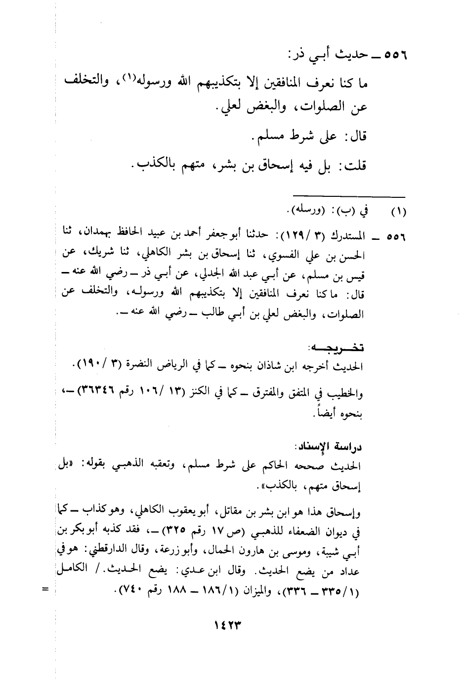 556 - المستدرك (3/ 129): حدثنا أبو جعفر أحمد بن عبيد الحافظ بهمدان، ثنا الحسن بن علي الفسوي، ثنا إسحاق بن بشر الكاهلي، ثنا شريك، عن قيس بن مسلم، عن أبي عبد الله الجدلي، عن أبي ذر -رضي الله عنه- قال: ما كنا نعرف المنافقين إلا بتكذيبهم الله ورسوله، والتخلف عن الصلوات، والبغض لعلي بن أبي طالب -رضي الله عنه-.