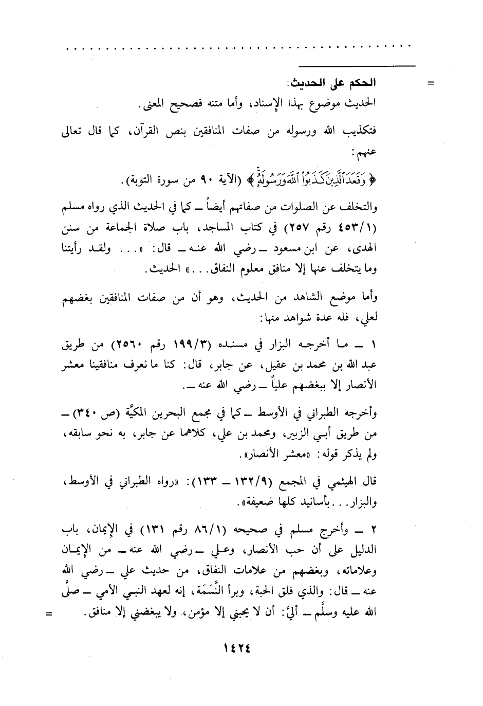 وأما موضع الشاهد من الحديث، وهو أن من صفات المنافقين بغضهم لعلي، فله عدة شواهد منها: