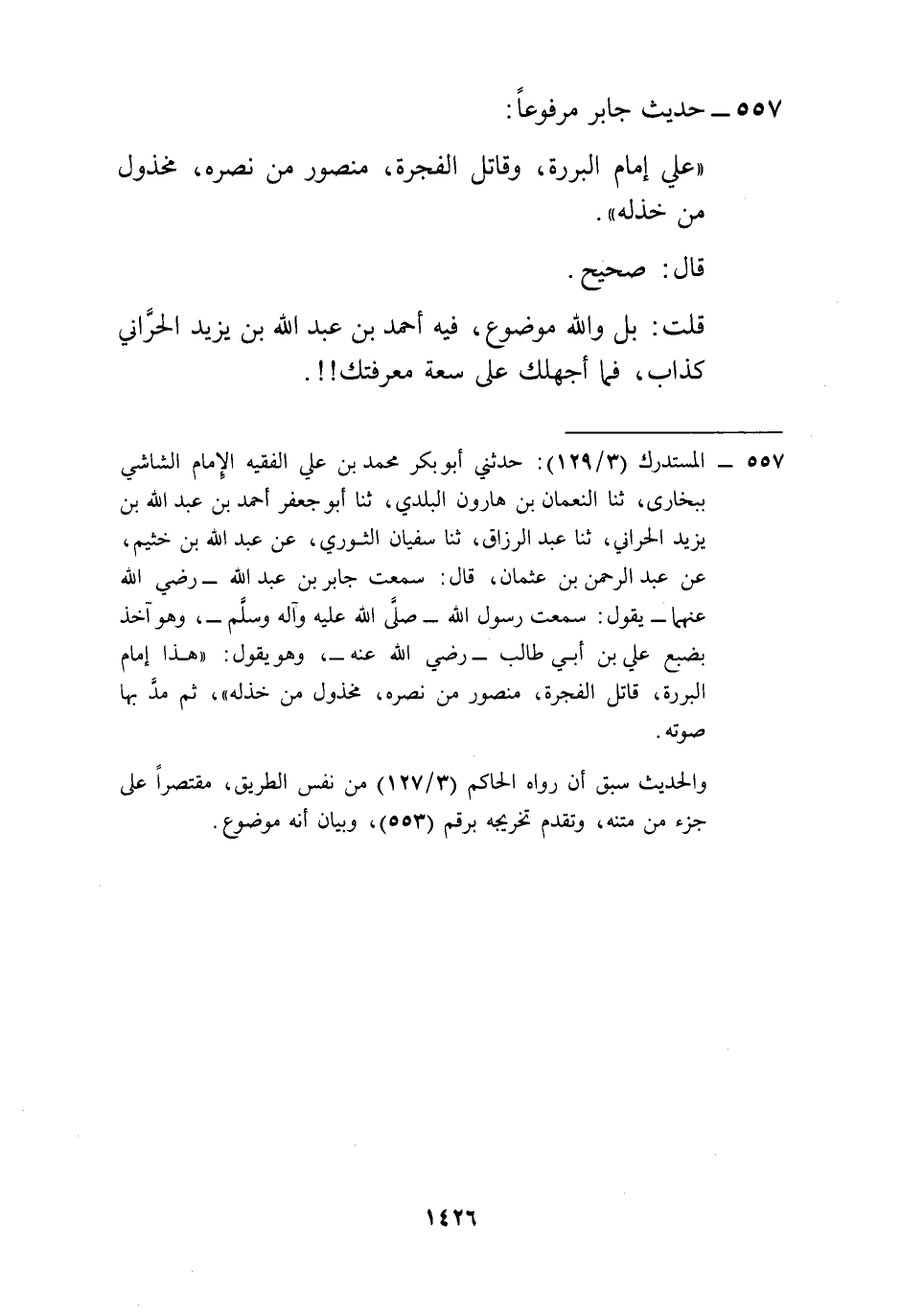 557 - المستدرك (3/ 129): حدثني أبو بكر محمد بن علي الفقيه الِإمام الشاشي ببخارى، ثنا النعمان بن هارون البلدي، ثنا أبو جعفر أحمد بن عبد الله بن يزيد الحراني، ثنا عبد الرزاق، ثنا سفيان الثوري، عن عبد الله بن خثيم، عن عبد الرحمن بن عثمان، قال: سمعت جابر بن عبد الله -رضي الله عنهما- يقول: سمعت رسول الله -صلى الله عليه وآله وسلم-، وهو آخذ بضبع علي بن أبي طالب -رضي الله عنه -، وهو يقول: "هذا إمام البررة، قاتل الفجرة، منصور من نصره، مخذول من خذله"، ثم مدَّ بها صوته.