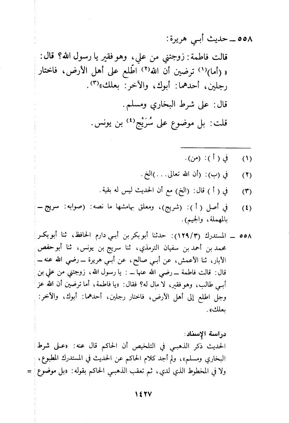 558 - المستدرك (3/ 129): حدثنا أبو بكر بن أبي دارم الحافظ، ثنا أبو بكر محمد بن أحمد بن سفيان الترمذي، ثنا سريج بن يونس، ثنا أبو حفص الأبار، ثنا الأعمش، عن أبي صالح، عن أبي هريرة -رضي الله عنه- قال: قالت فاطمة -رضي الله عنها-: يا رسول الله، زوجتني من علي بن أبي طالب، وهو فقير، لا مال له؟ فقال: "يا فاطمة، أما ترضين أن الله عز وجل اطلع إلى أهل الأرض، فاختار رجلين، أحدهما: أبوك، والآخر: بعلك".